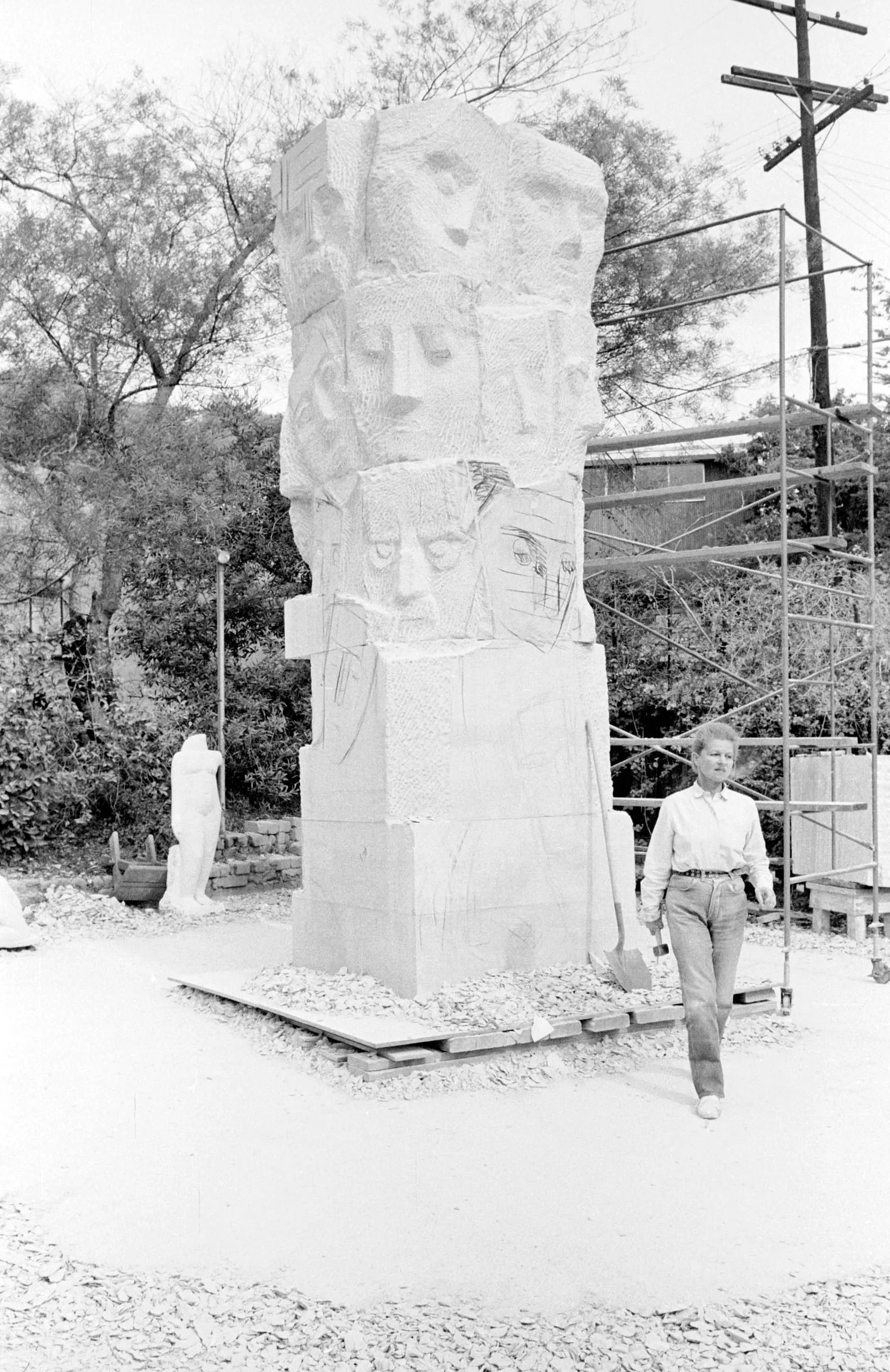 Black and white photograph of a monumental stone column carved with stacked human faces, with a person walking in front of it and scaffolding visible behind