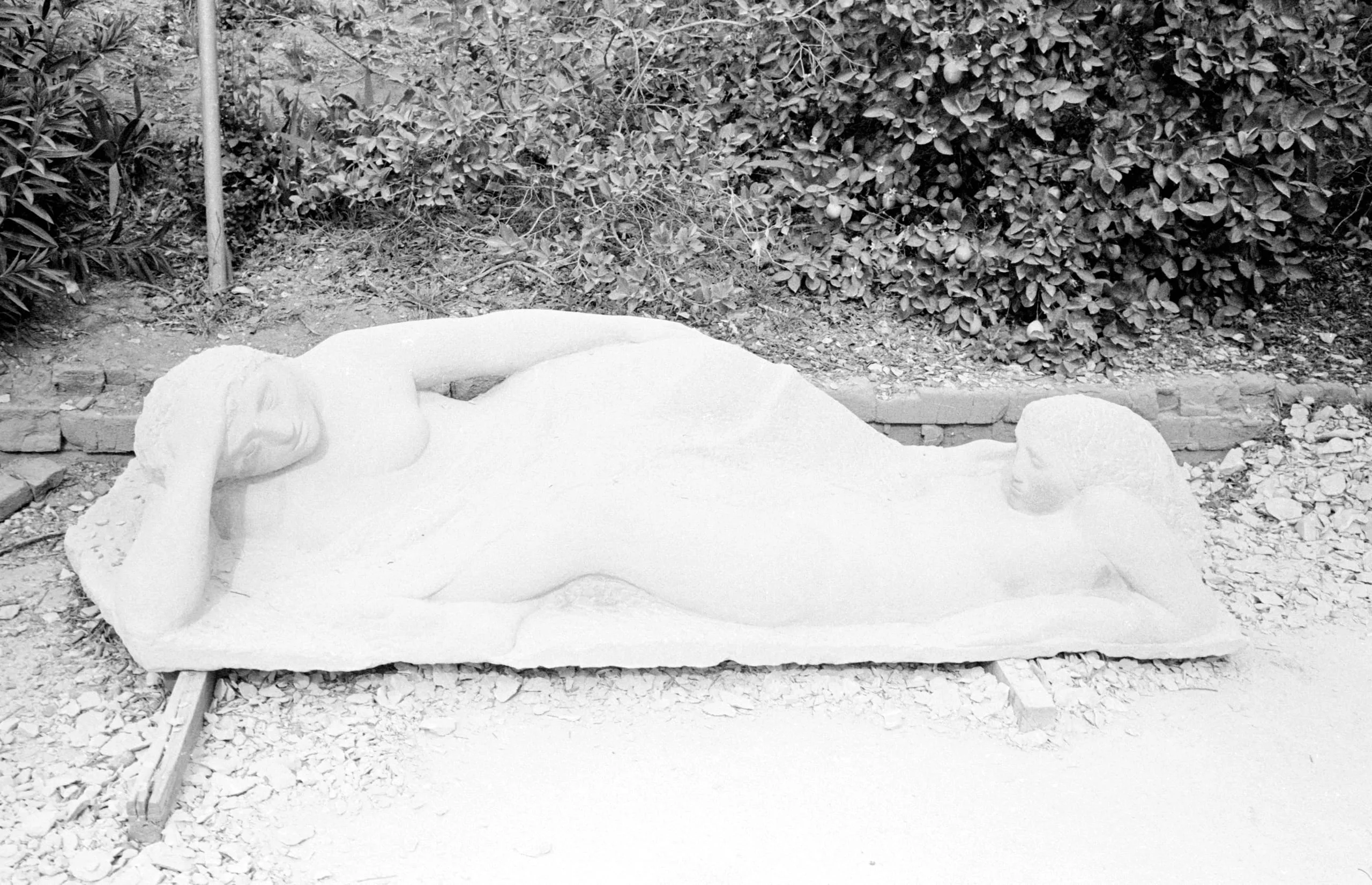 Black and white photograph of a large reclining nude stone sculpture lying on a raised slab outdoors, surrounded by stone chips and dense foliage