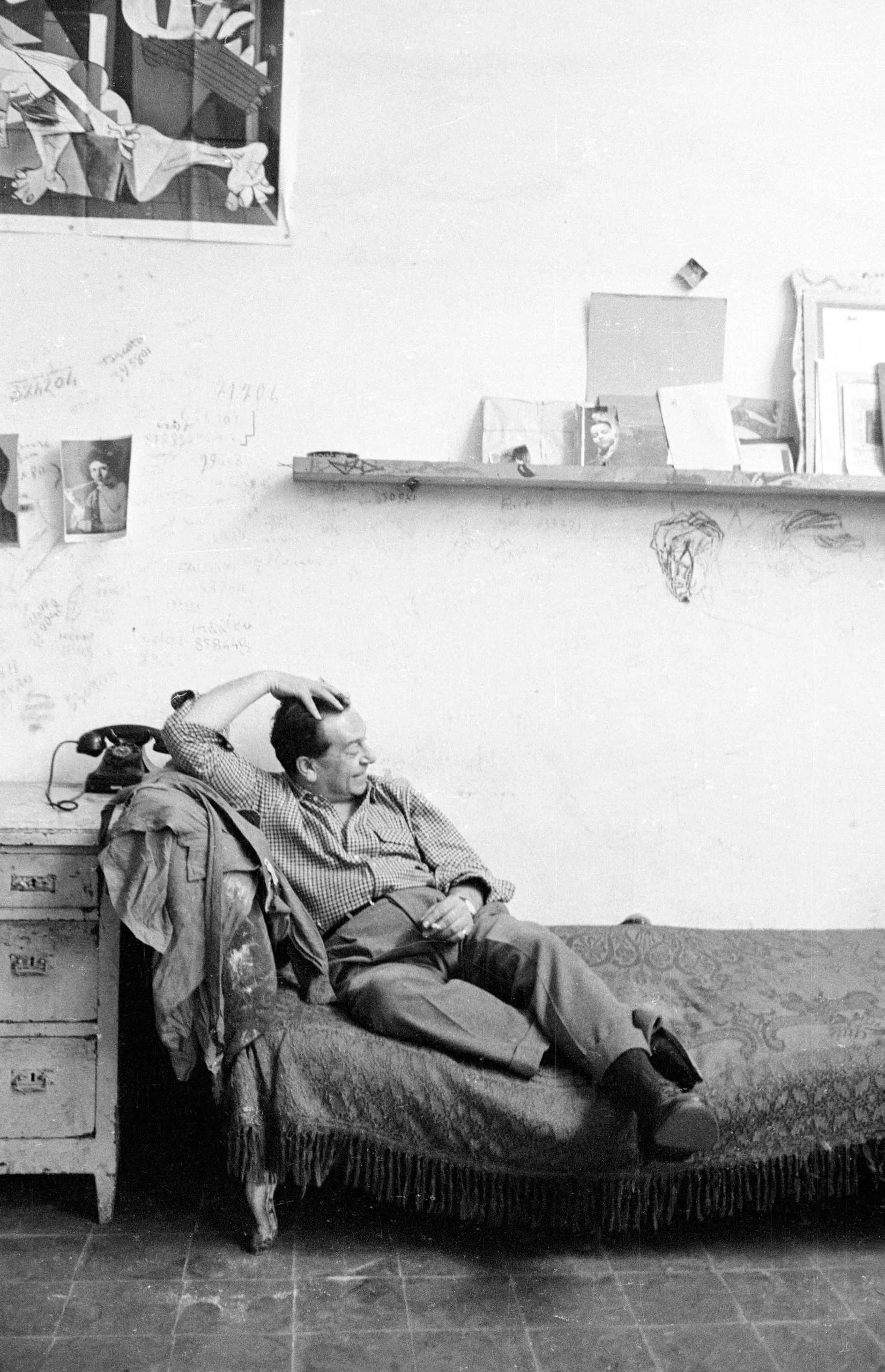 Black and white photograph of a dark-haired man in a plaid shirt reclining on a fringed chaise lounge in a room with a sketch-covered wall and a Cubist print above