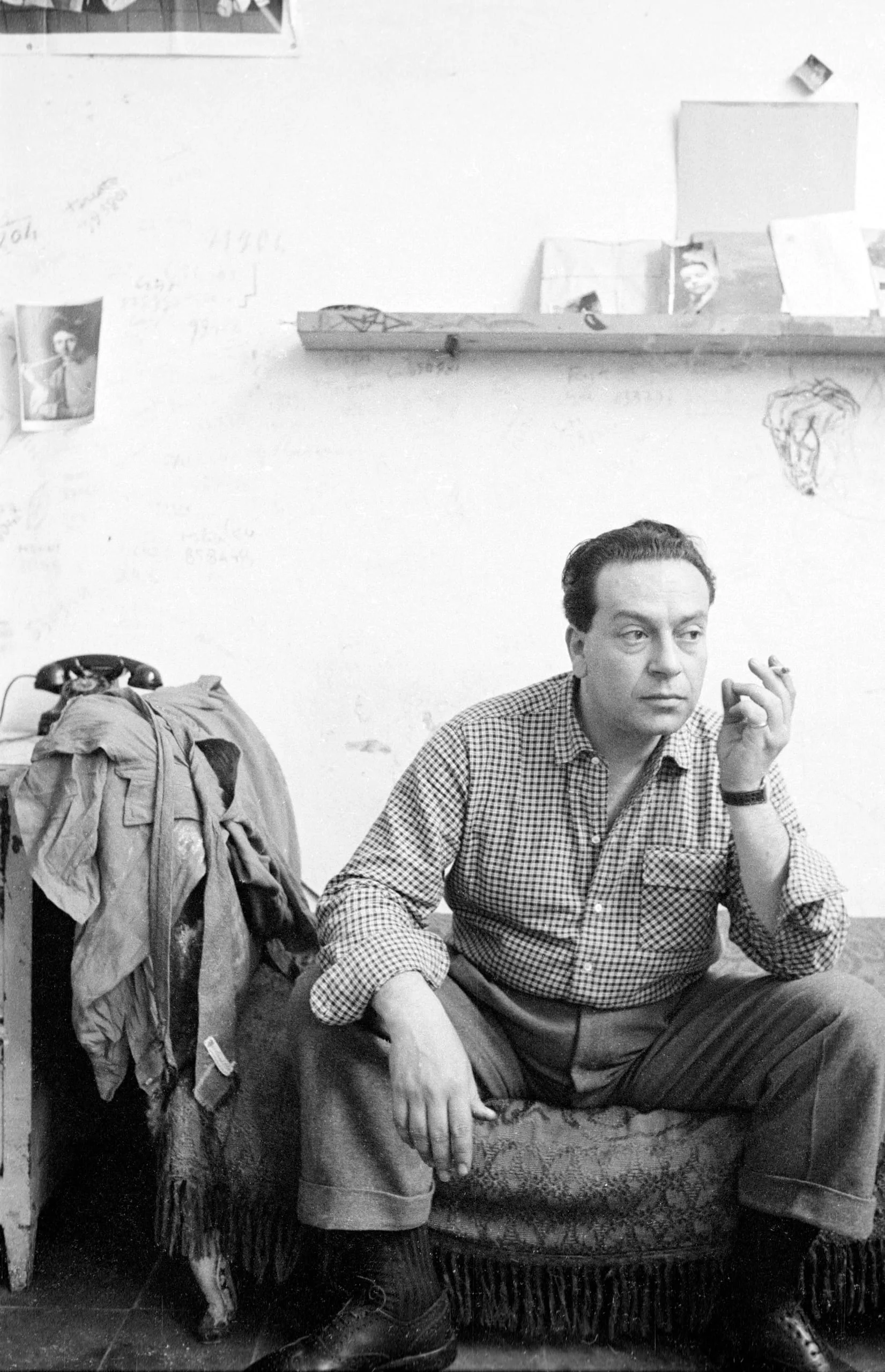 Black and white photograph of a man seated on a fringed ottoman, holding a cigarette, in a cluttered studio with handwritten notes on the wall behind him