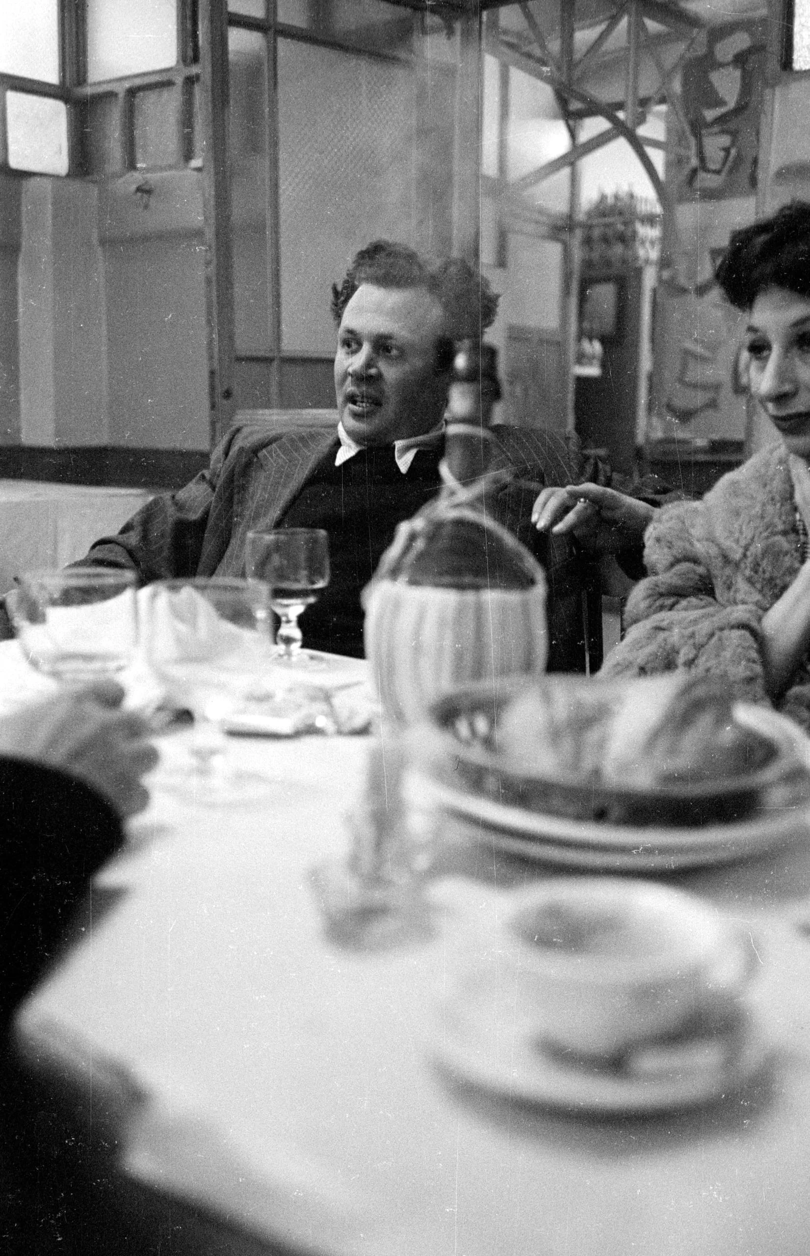 Black and white photograph of a man and woman seated at a set dining table in a restaurant, the man speaking with lips parted, the woman smiling beside him