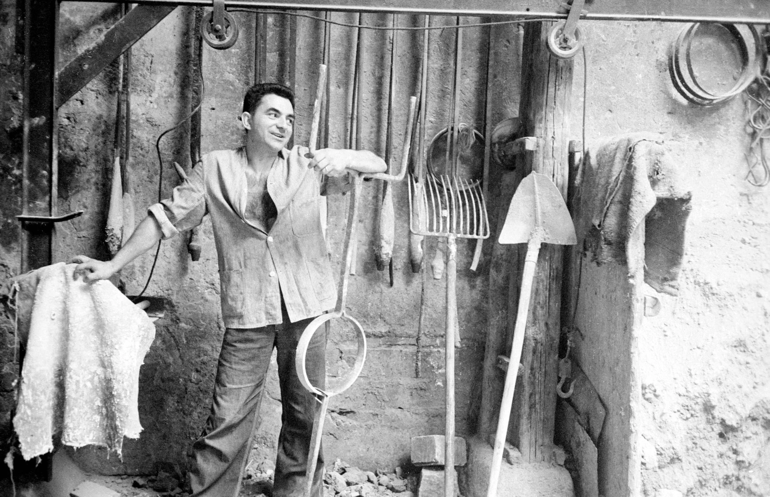 Black and white photograph of a smiling man in a work shirt standing against a rough stone wall hung with garden and farm tools