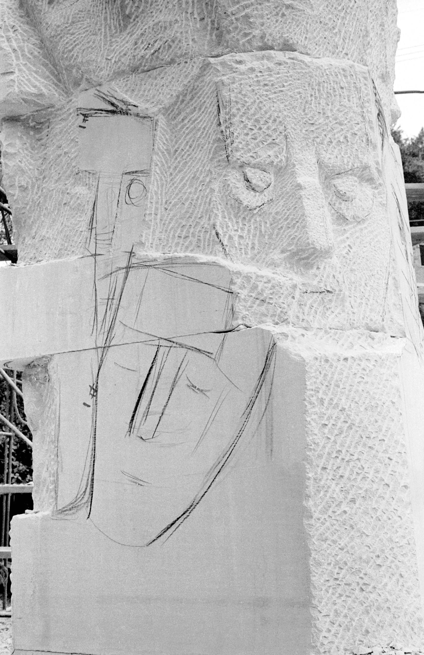 Black and white photograph of a large white stone sculpture in progress, with one partially carved face in relief above and a pencil-sketched face drawn on the uncarved surface below