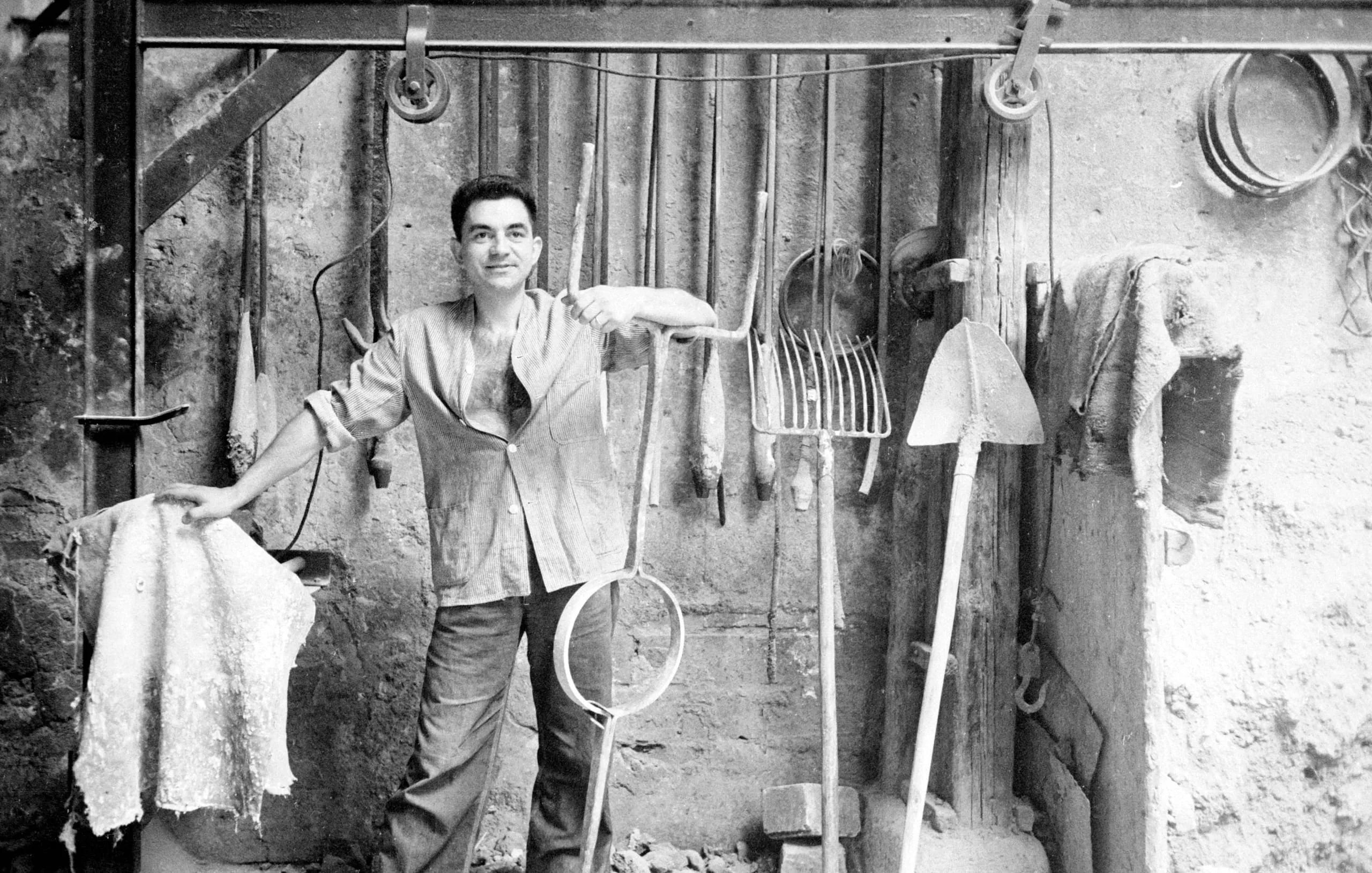 Black and white photograph of a man standing arms outstretched against a rough wall hung with garden tools including rakes and shovels