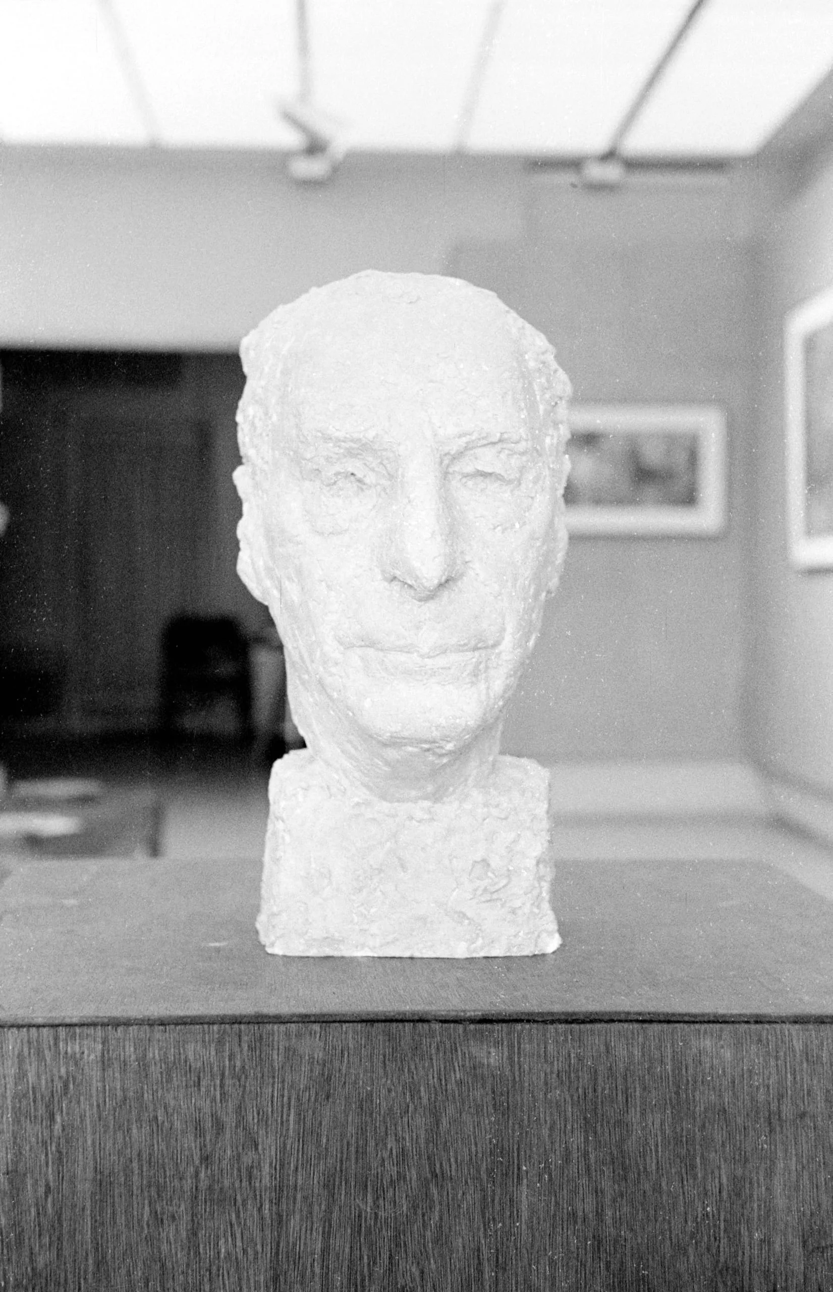 Small white plaster portrait bust of a man facing forward, with a roughly textured surface, displayed on a wooden shelf in a gallery setting