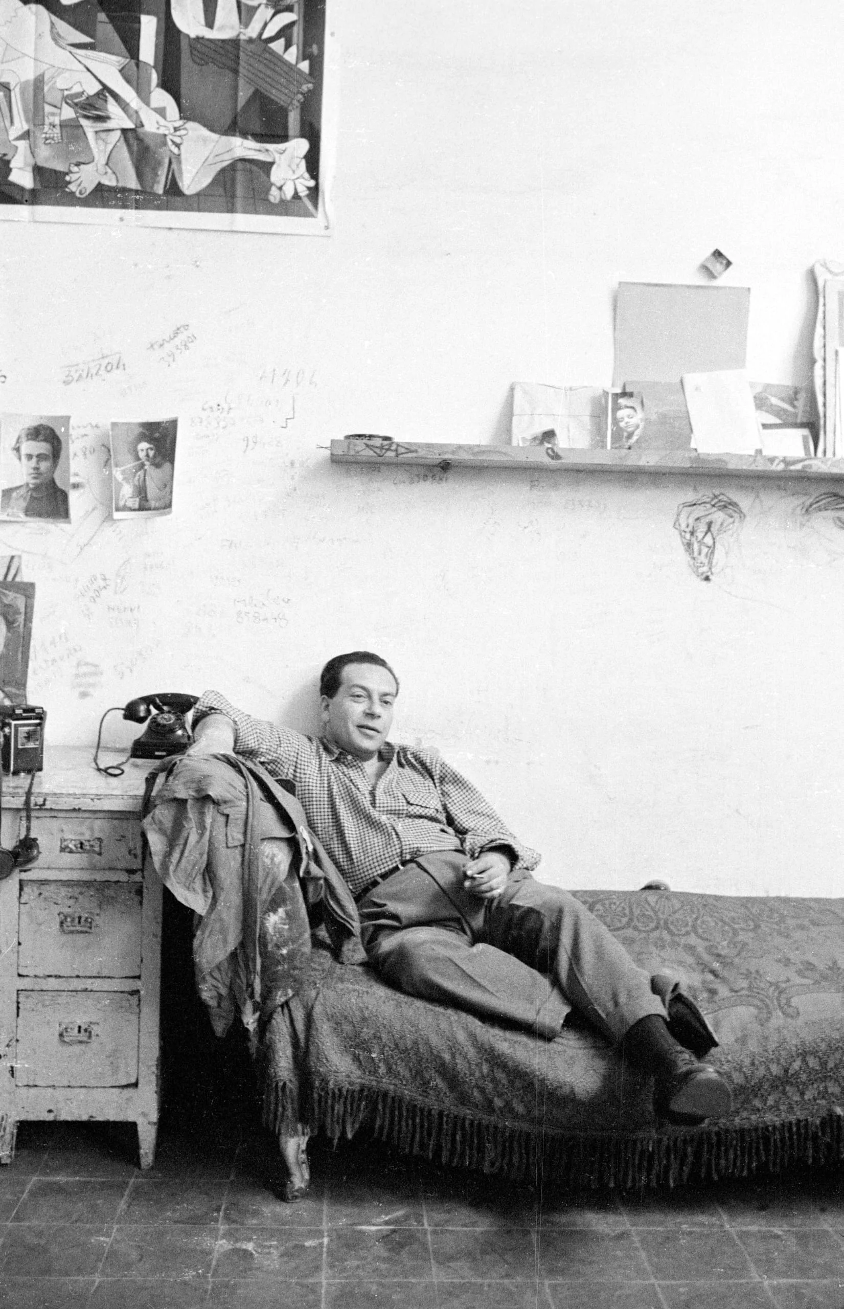 Black and white photograph of a man reclining on a fringed daybed in a room with a plaster wall covered in handwritten notes, small portrait photographs, and a large painting reproduction near the ceiling