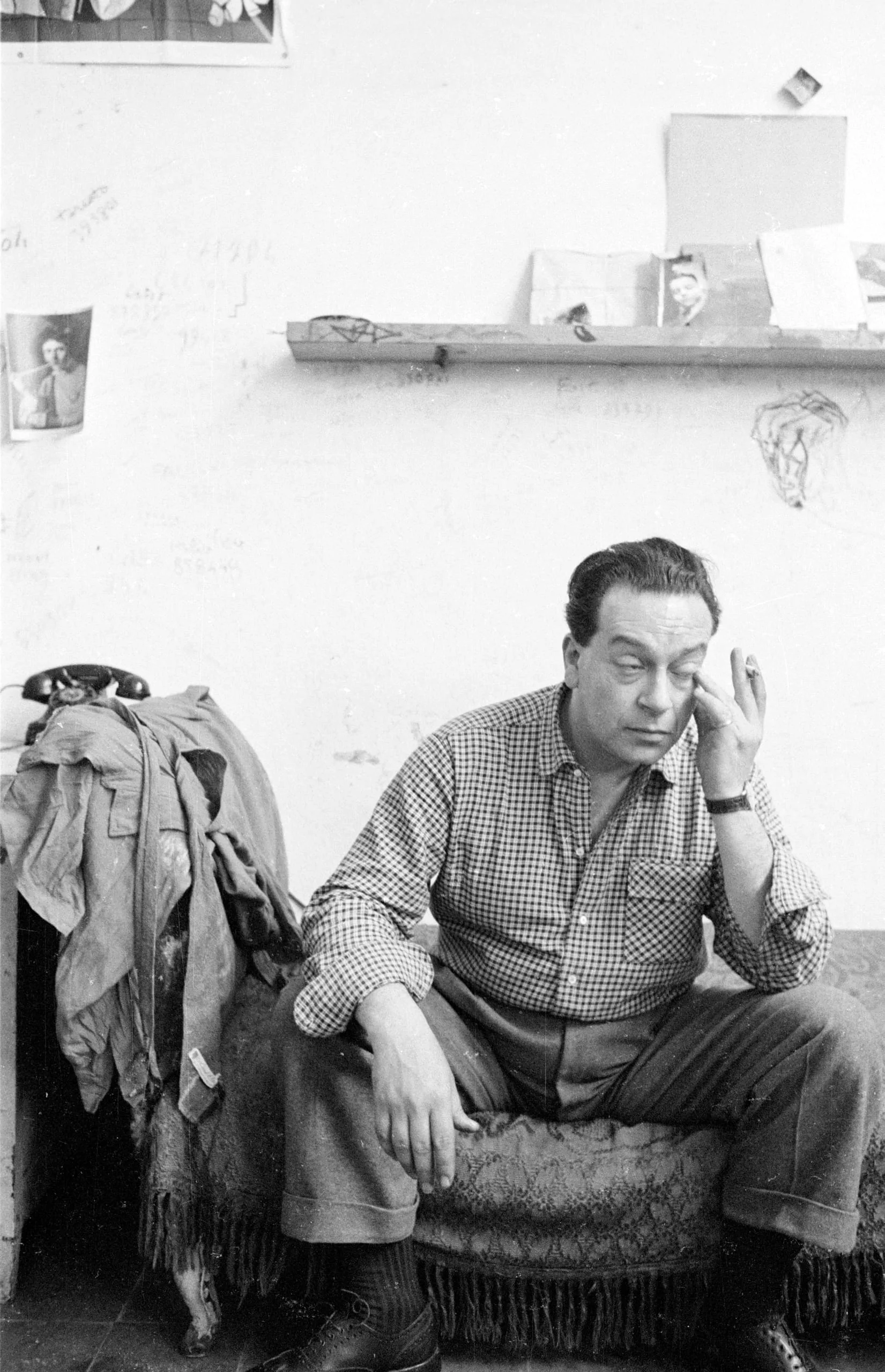 Black and white photograph of a man in a checked shirt seated on a tufted ottoman, head resting on one hand, in a studio with photographs pinned to the wall behind him