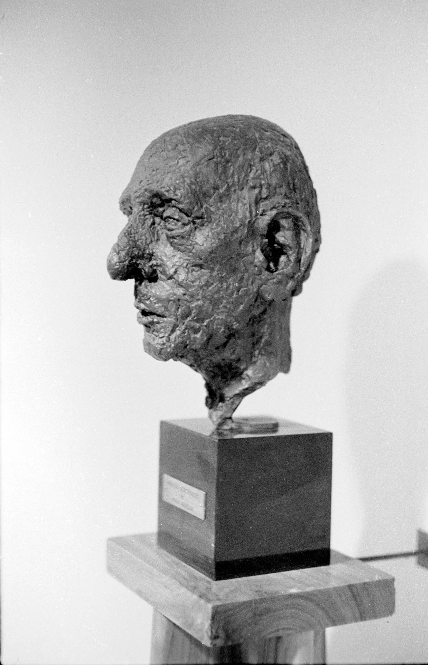Bronze or dark metal portrait bust of a bald older man in left profile, with heavily textured, roughly worked surface, mounted on a dark rectangular pedestal and wooden plinth