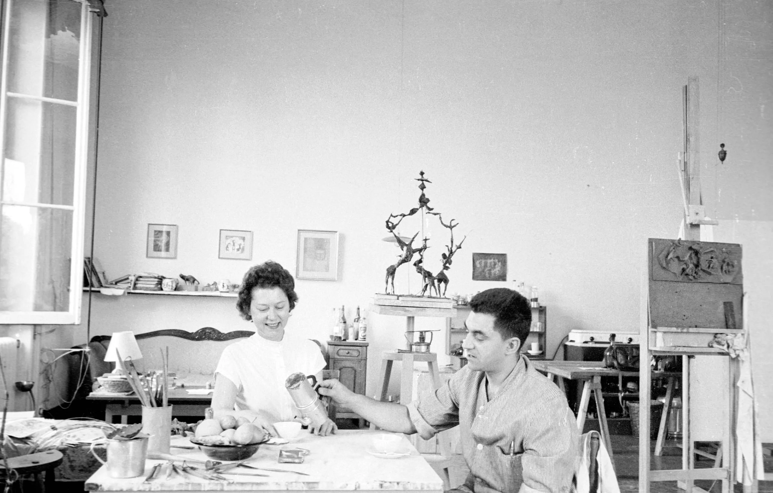 Black and white photograph of a man and woman at a cluttered studio worktable, laughing, surrounded by art supplies, sculptures, and an easel
