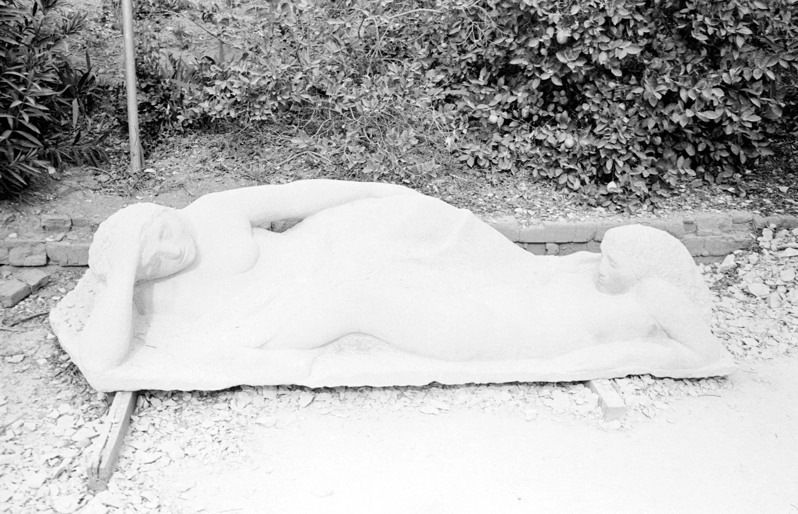 Black and white photograph of a large white stone sculpture of a reclining nude figure, stretched across a flat slab on wooden supports outdoors