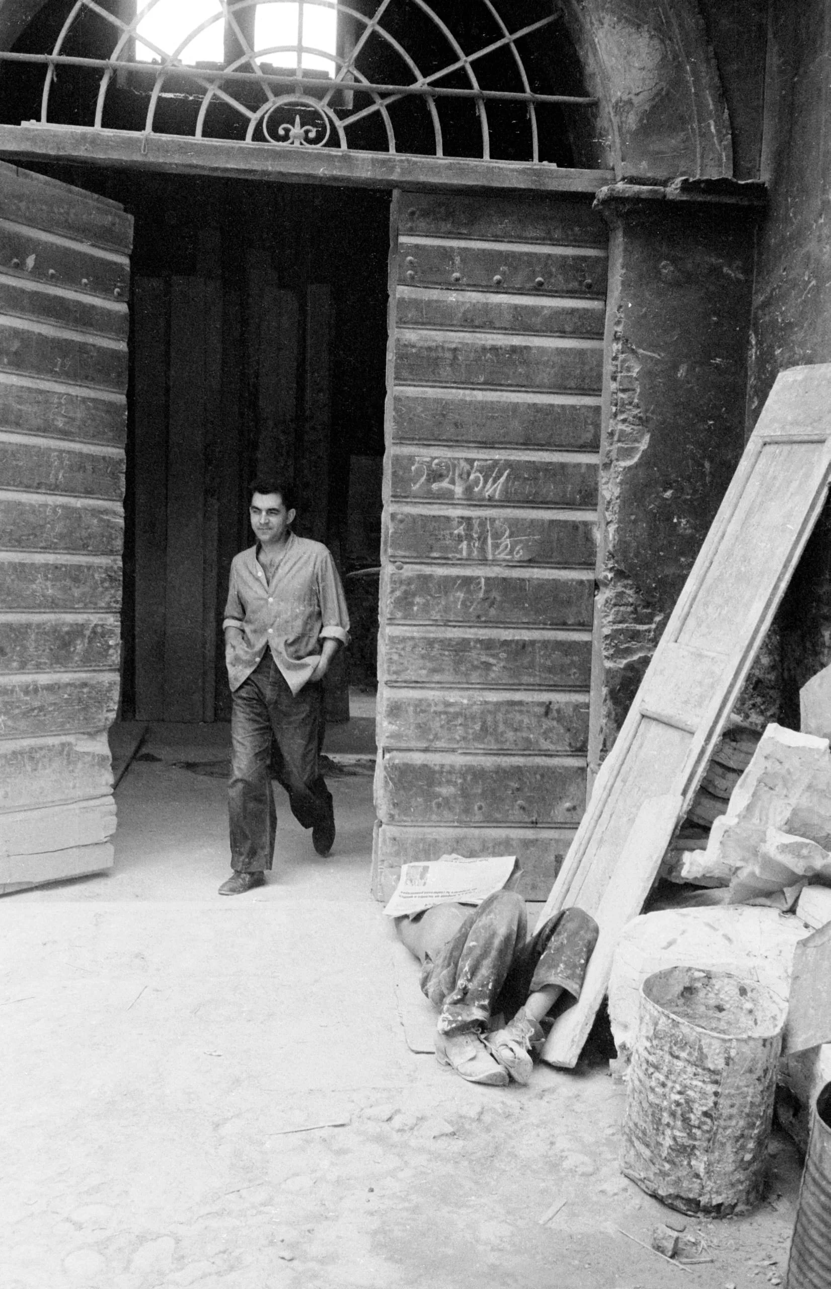 Black and white photograph of a young man walking through a large arched doorway, with a second figure lying on the ground nearby amid construction debris
