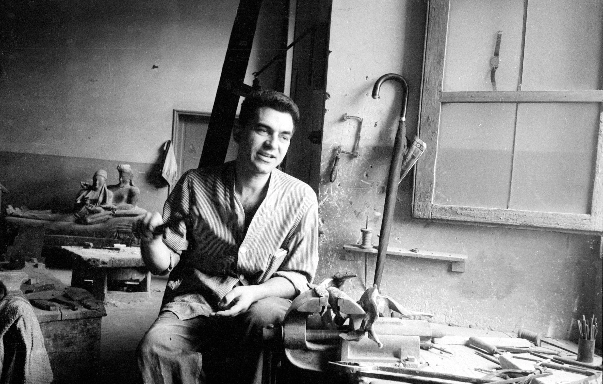 Black and white photograph of a young man seated in a sculptor's studio, surrounded by tools and clay figures, smiling toward the camera