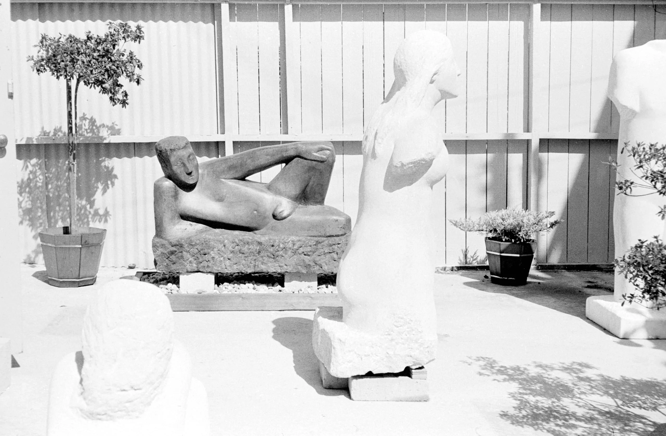 Black and white photograph of an outdoor sculpture courtyard with two stone figures — a reclining carved figure and a tall standing abstracted form — alongside rough unfinished stone blocks
