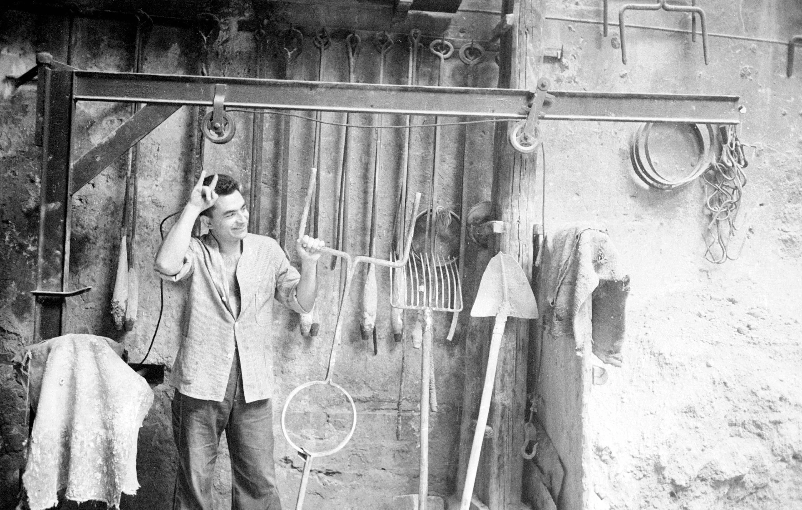 Black and white photograph of a young man standing before a tool-hung stone wall, holding a rake and looking upward with a slight smile