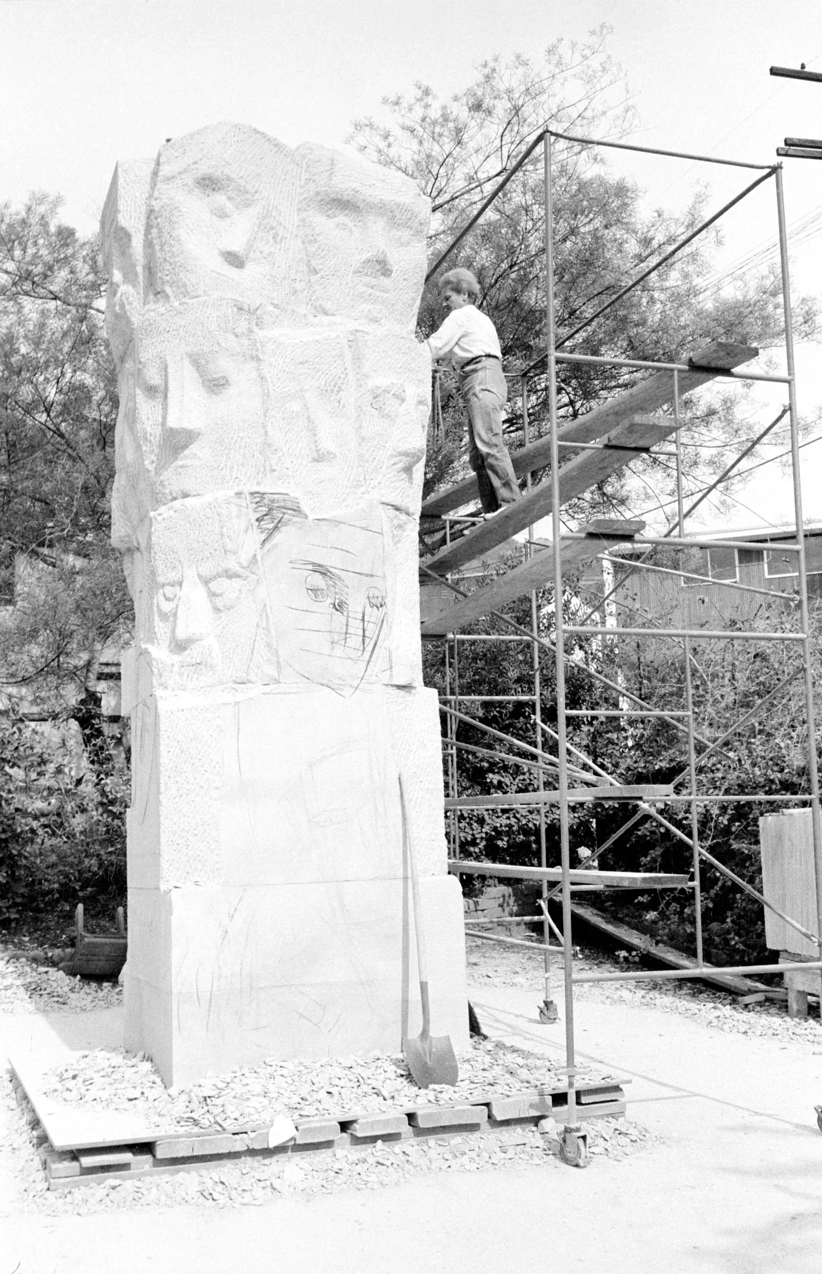 Black and white photograph of a tall stone column sculpture with carved human faces stacked vertically, a man standing on metal scaffolding beside it outdoors