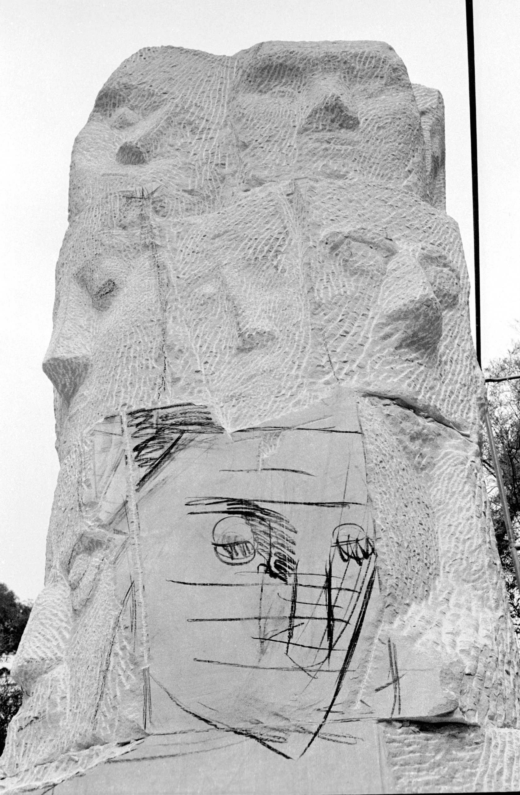 Black-and-white photograph of a large rough-hewn stone monolith with a gestural charcoal or marker face drawing on paper affixed to its lower surface, outdoors