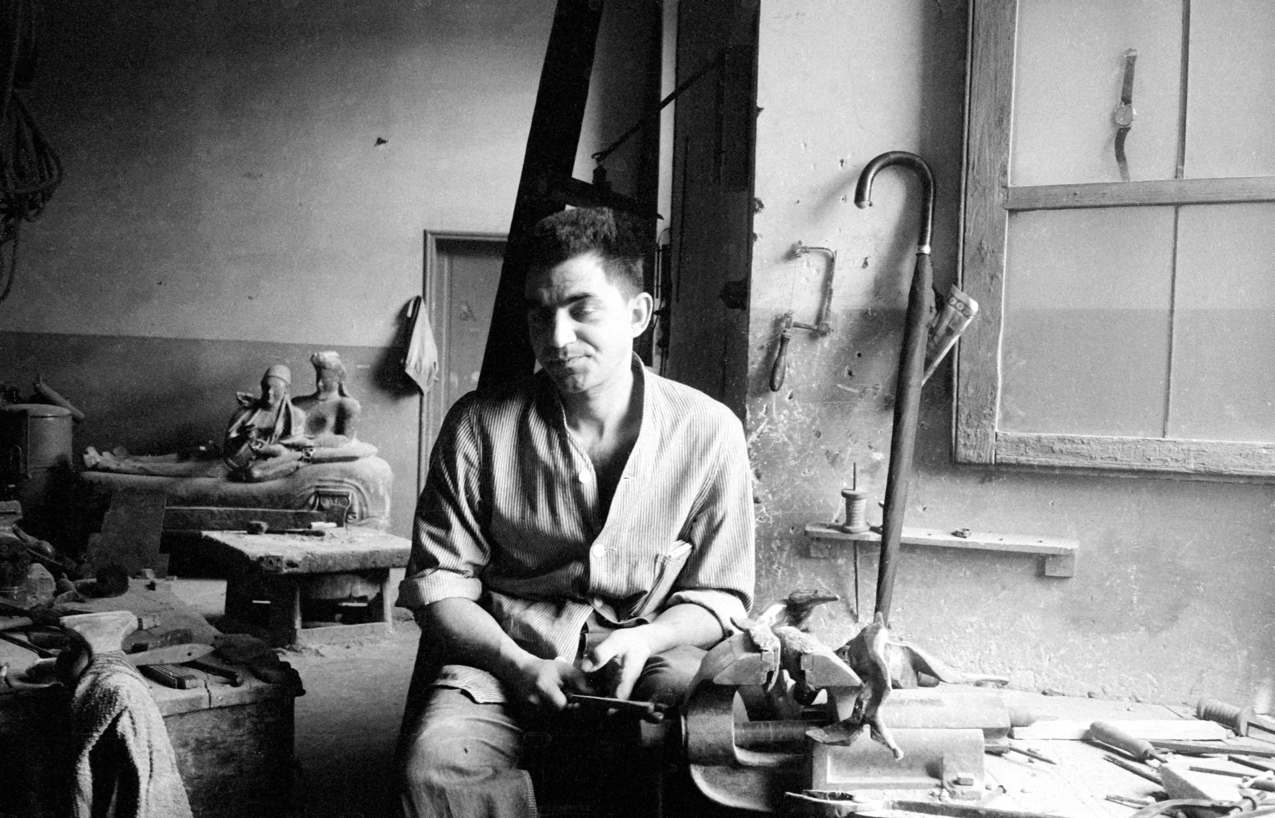 Black and white photograph of a young man seated in a sculptor's studio, holding a small sculptural object, surrounded by tools and unfinished figurative works
