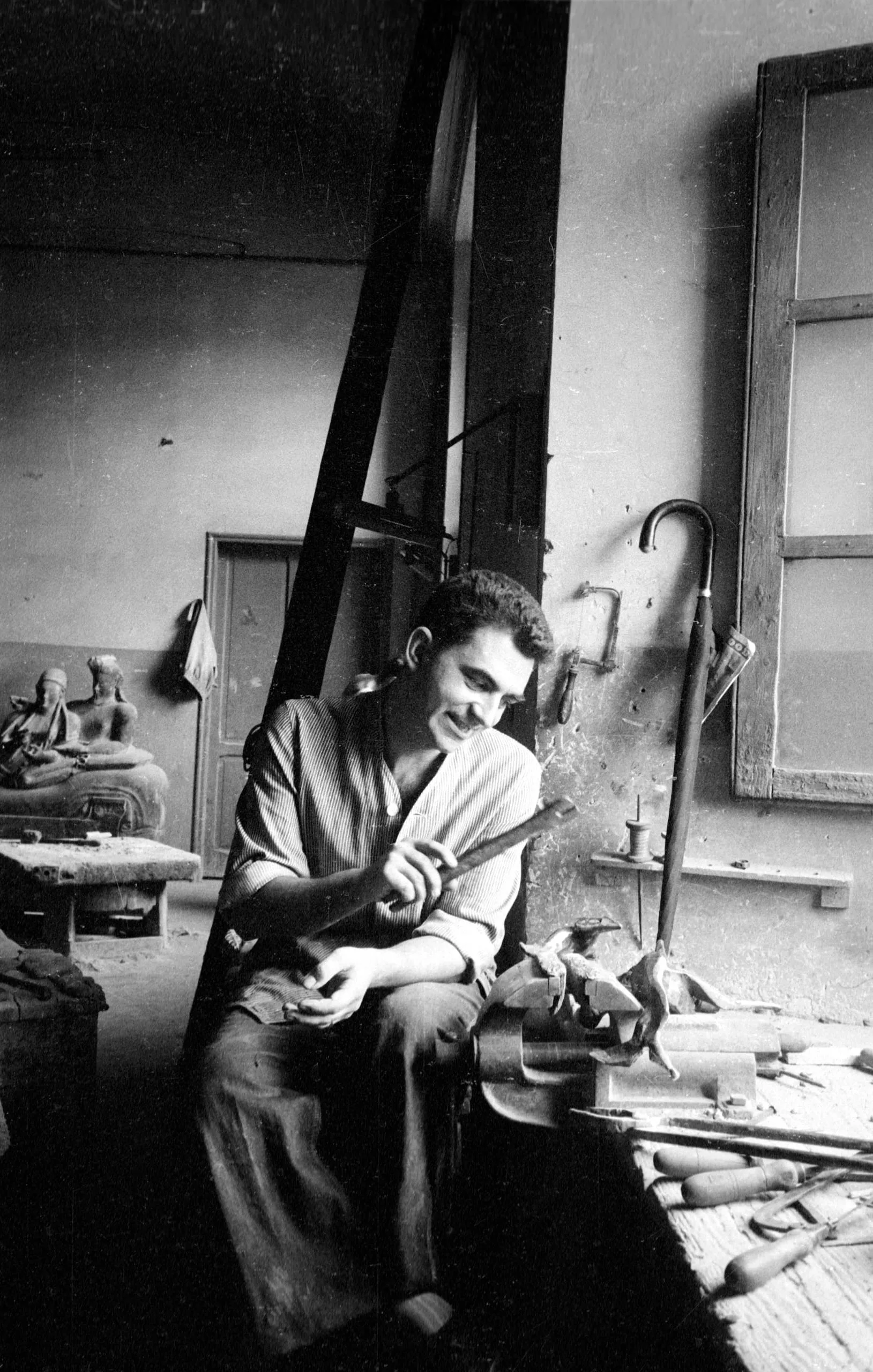 Black and white photograph of a young man in a sculptor's studio, seated and carving a small object with a chisel, chips flying, surrounded by tools