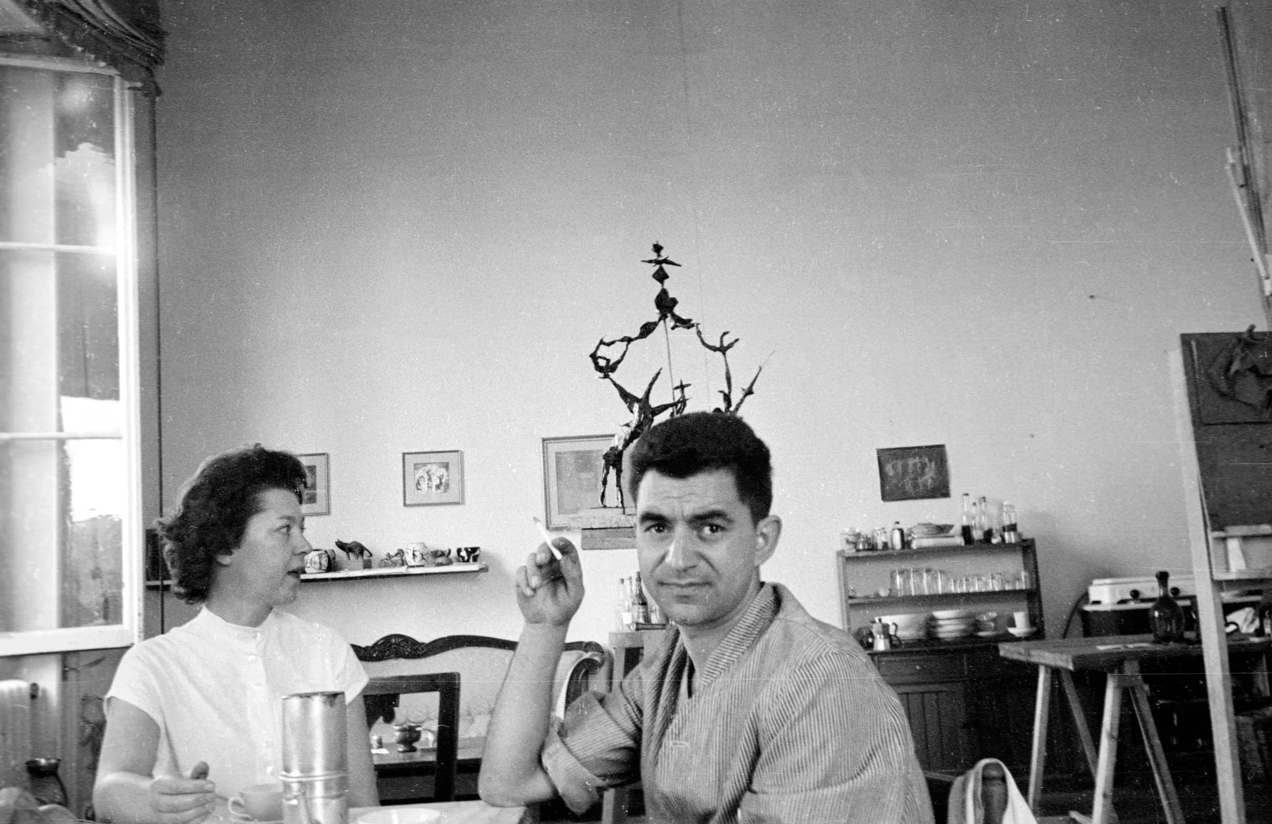 Black and white photograph of a man and woman seated at a table indoors, man in foreground holding a cigarette, small wire sculpture visible on wall behind them