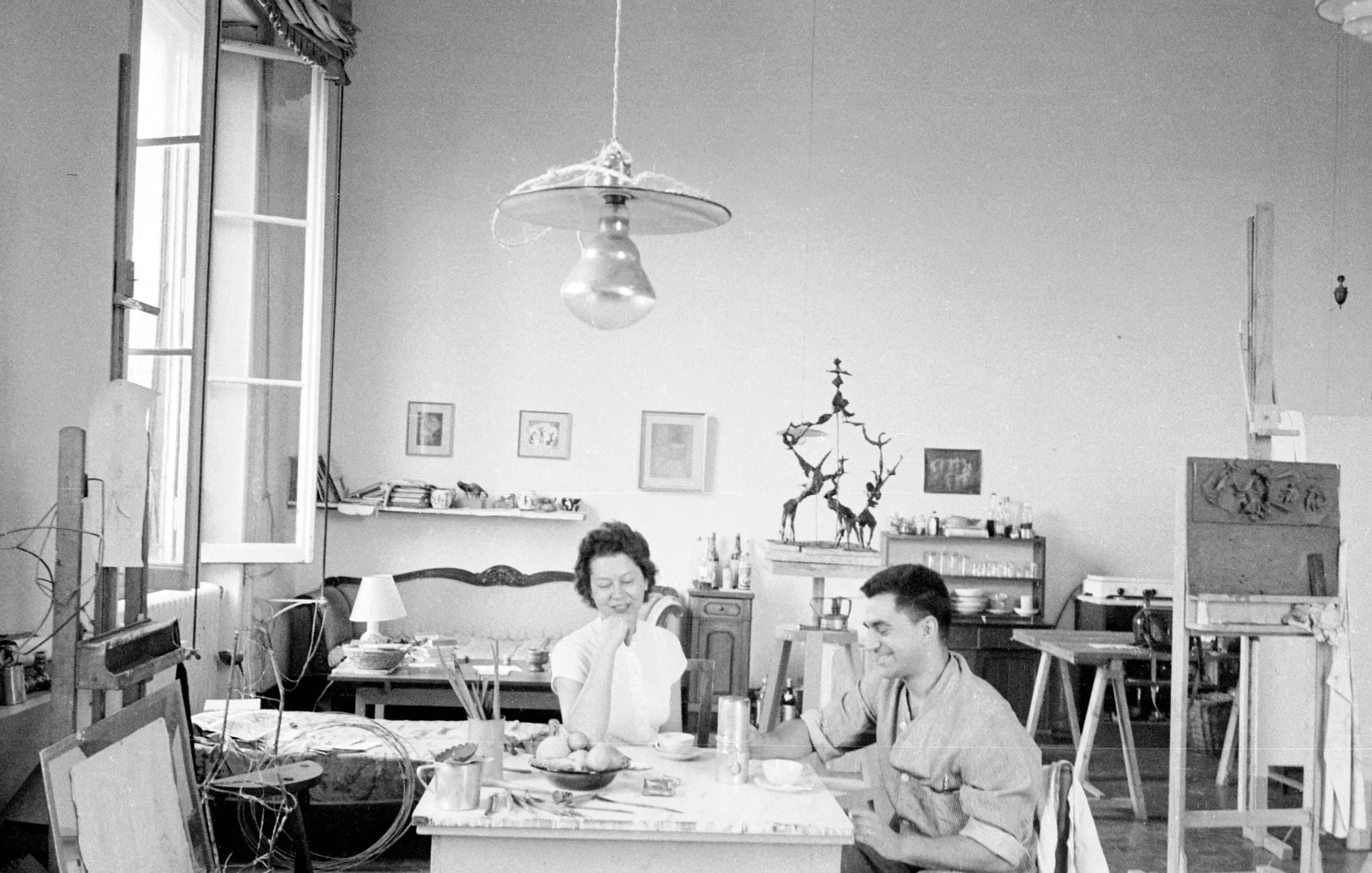 Black and white photograph of a woman and man seated at a small table in an artist's studio, surrounded by easels, canvases, and framed works