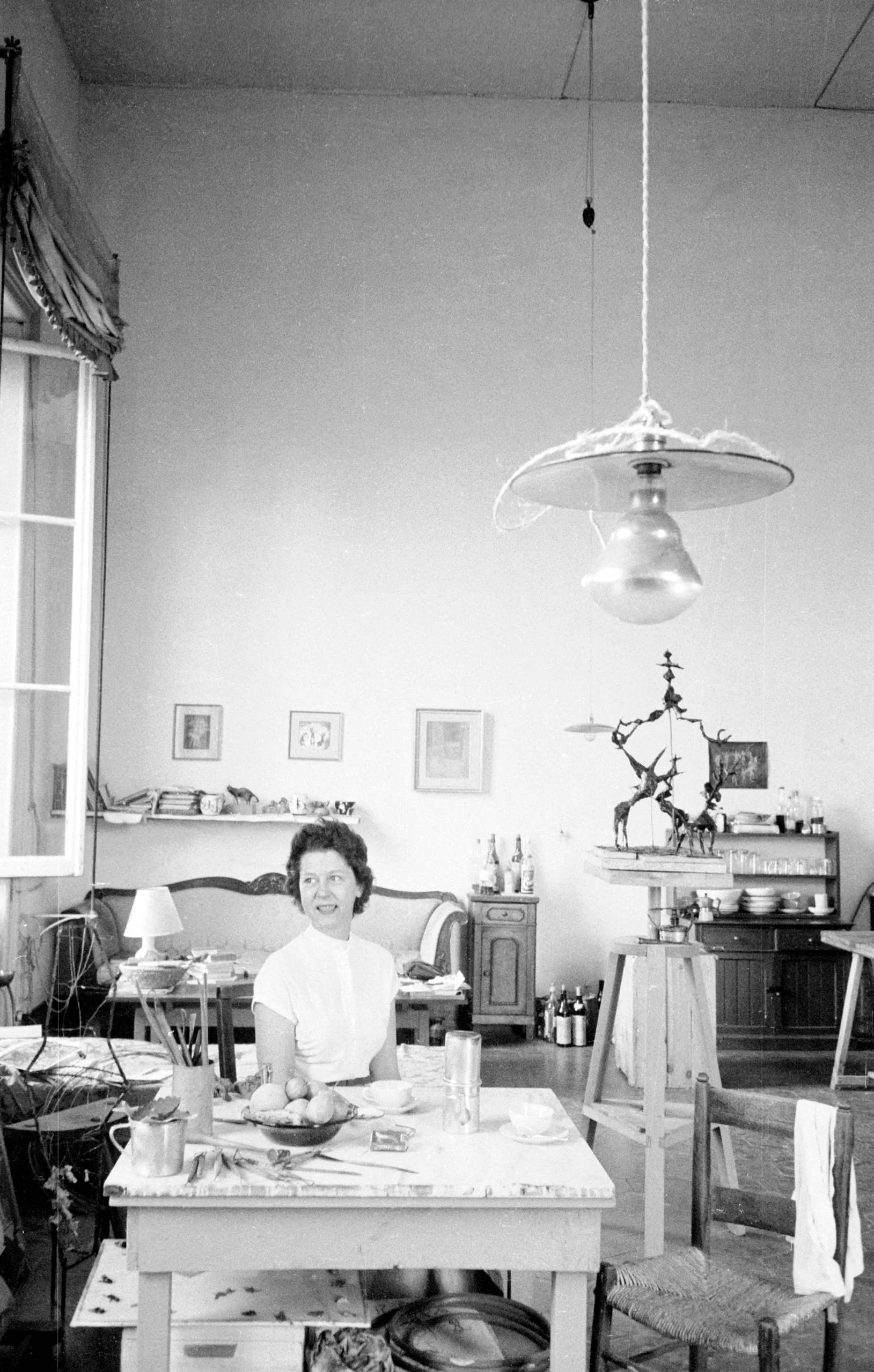 Black and white photograph of a smiling woman in a white shirt seated at a paint-stained table in a high-ceilinged artist's studio, with a pendant lamp in the foreground