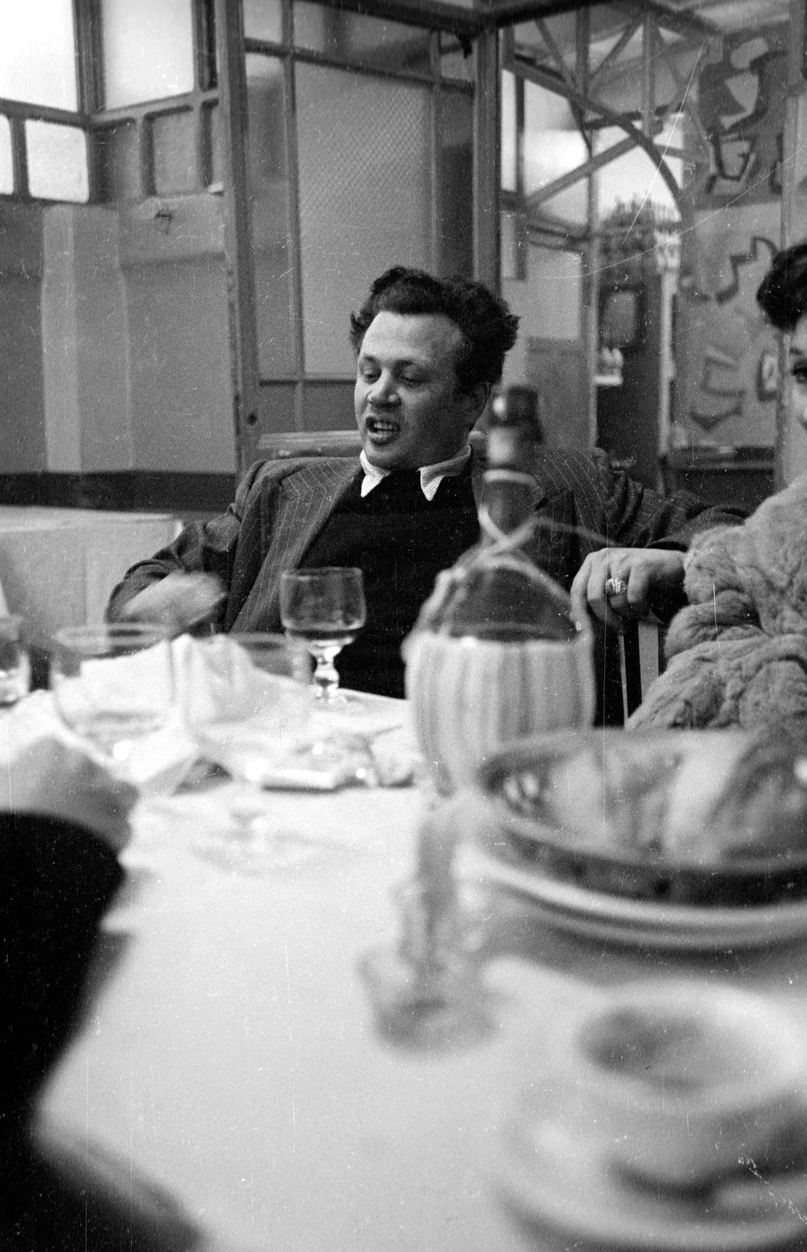 Black and white photograph of a man with dark hair and an open mouth, seated at a restaurant table set with glassware, another figure partially visible to his right