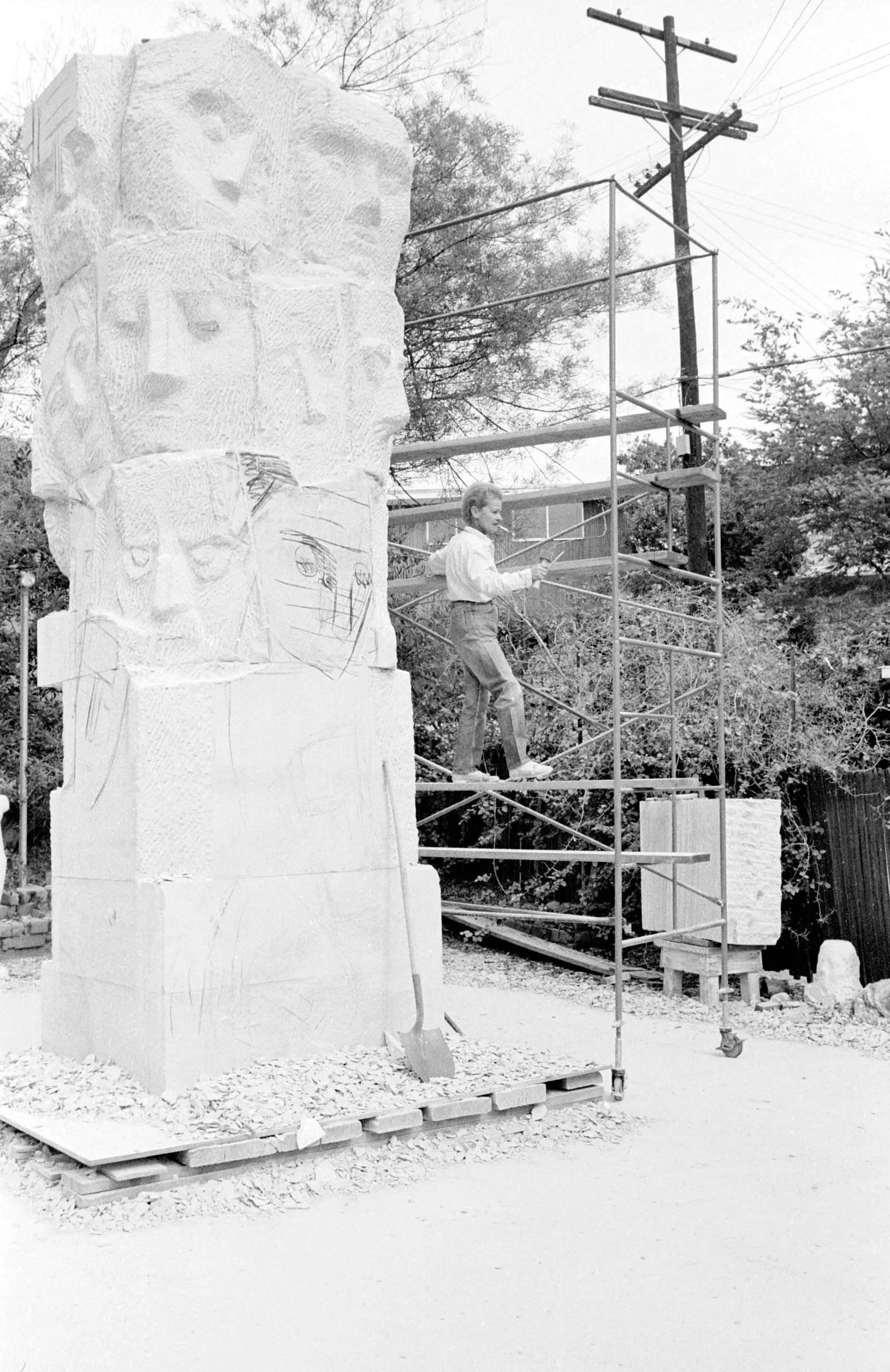 Black and white photograph of a man on scaffolding carving a tall stone column sculpture with multiple human faces, outdoors