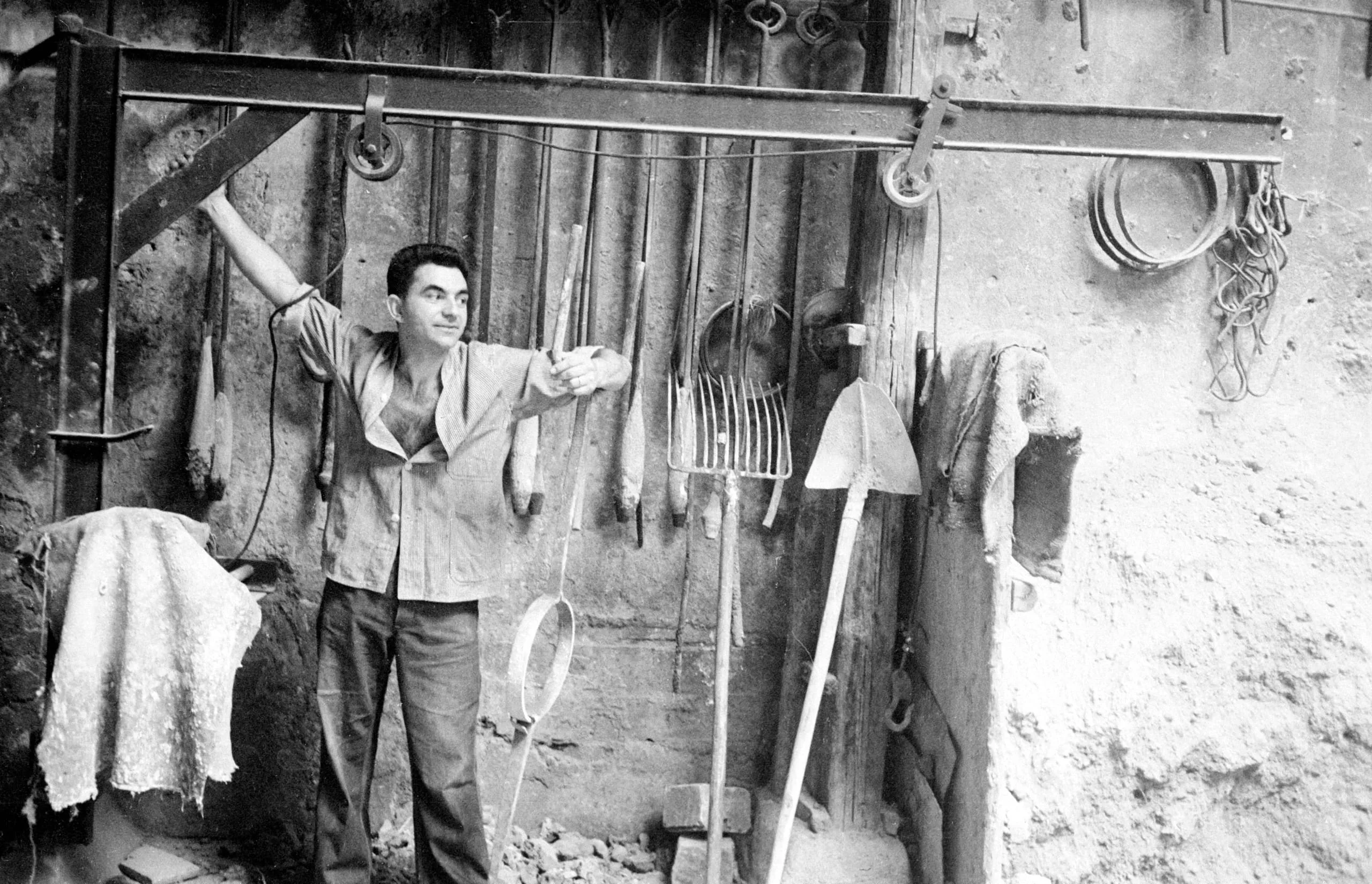 Black and white photograph of a man in a work shirt standing before a stone wall hung with farm tools, one arm raised to grip an overhead steel rail with pulley wheels