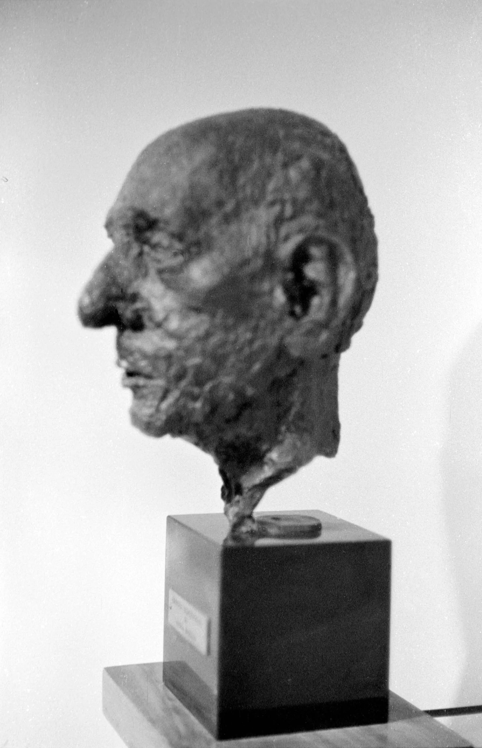 Bronze or dark metal sculptural head of an older bald man in left profile, with heavily textured surface, mounted on a dark square pedestal