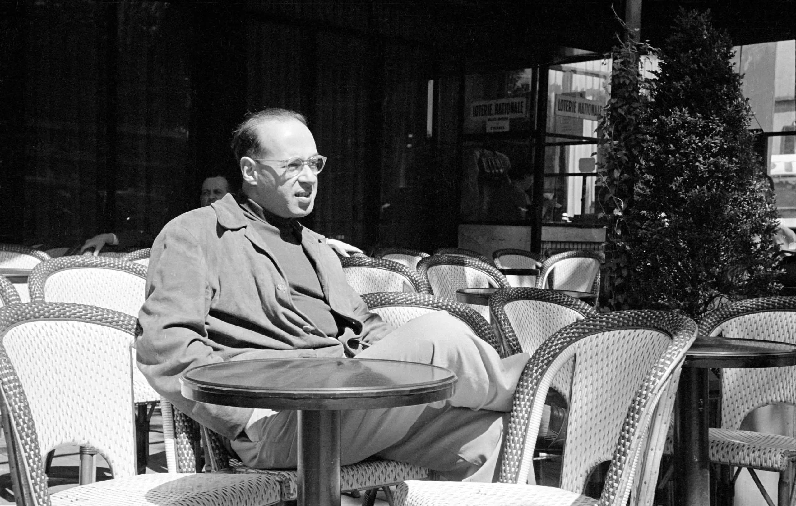 Black and white photograph of a man in glasses and a light jacket seated alone at a small round café table on an outdoor terrace, looking to his left