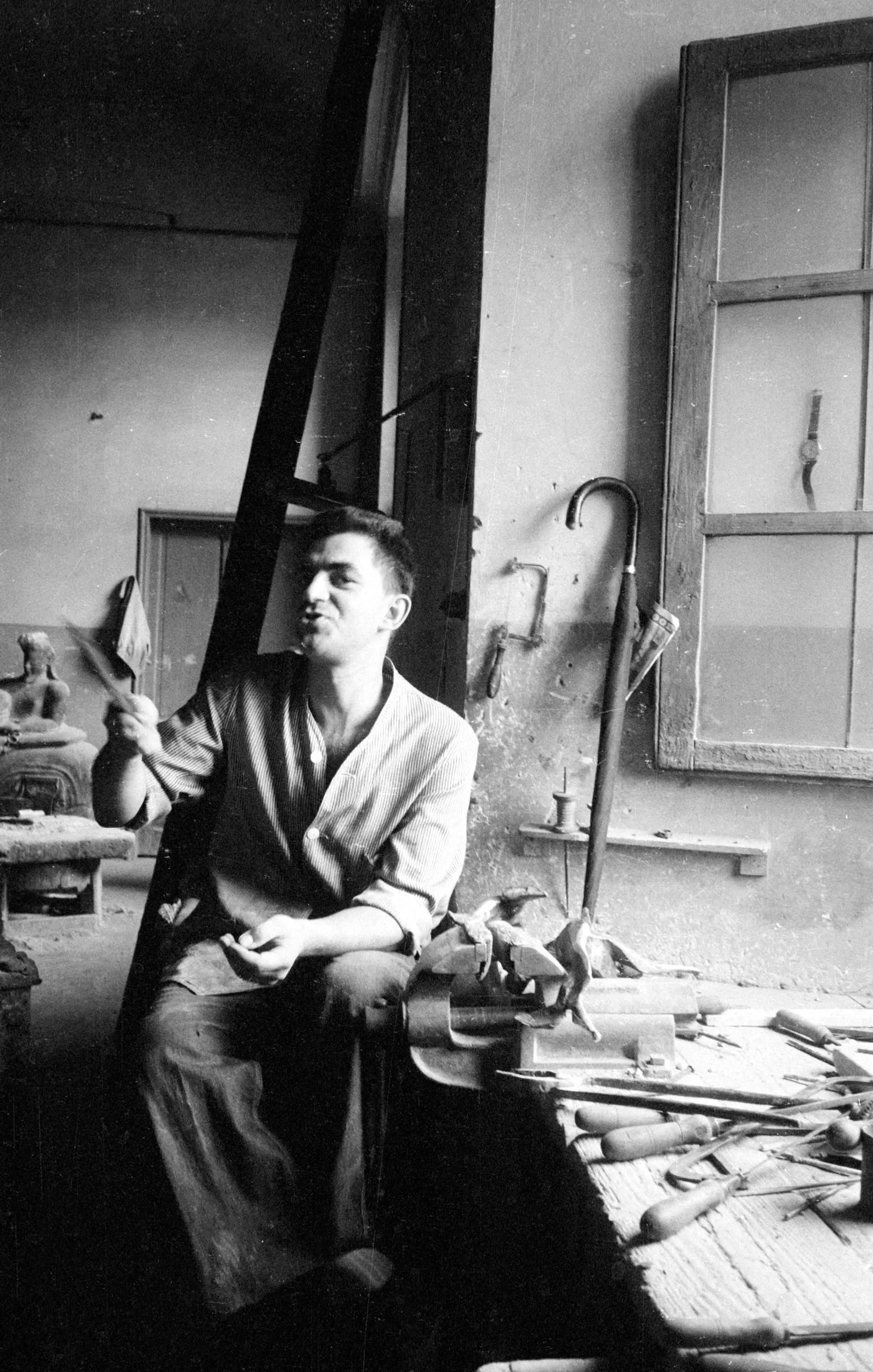 Black and white photograph of a young man seated in a sculptor's studio, holding a small tool aloft, surrounded by chisels and figurative works