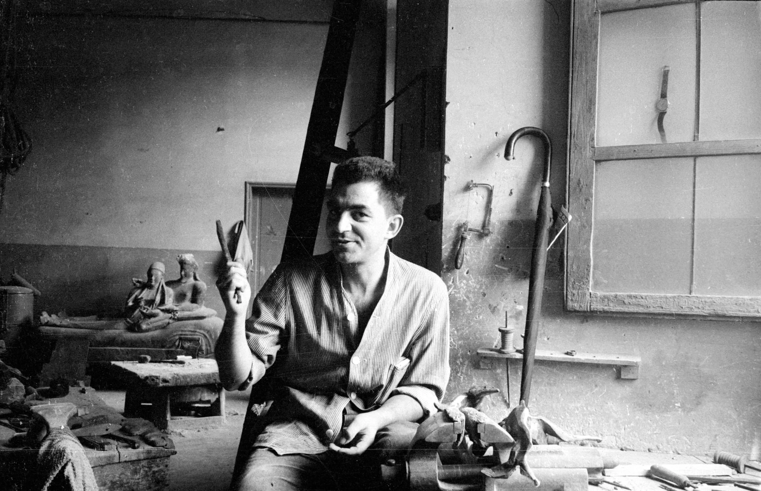 Black and white photograph of a young man seated in a sculptor's workshop, holding two fingers up, surrounded by tools and a clay figure in the background
