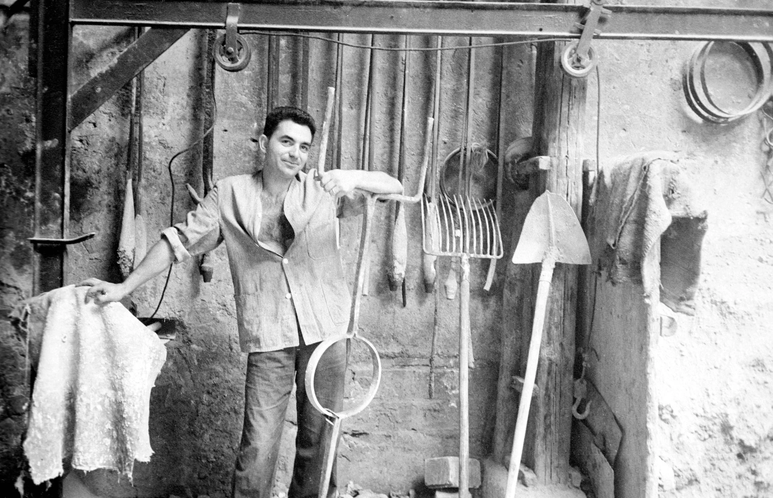 Black and white photograph of a smiling young man standing with arms spread wide before a rough plaster wall hung with rakes, shovels, and other long-handled tools
