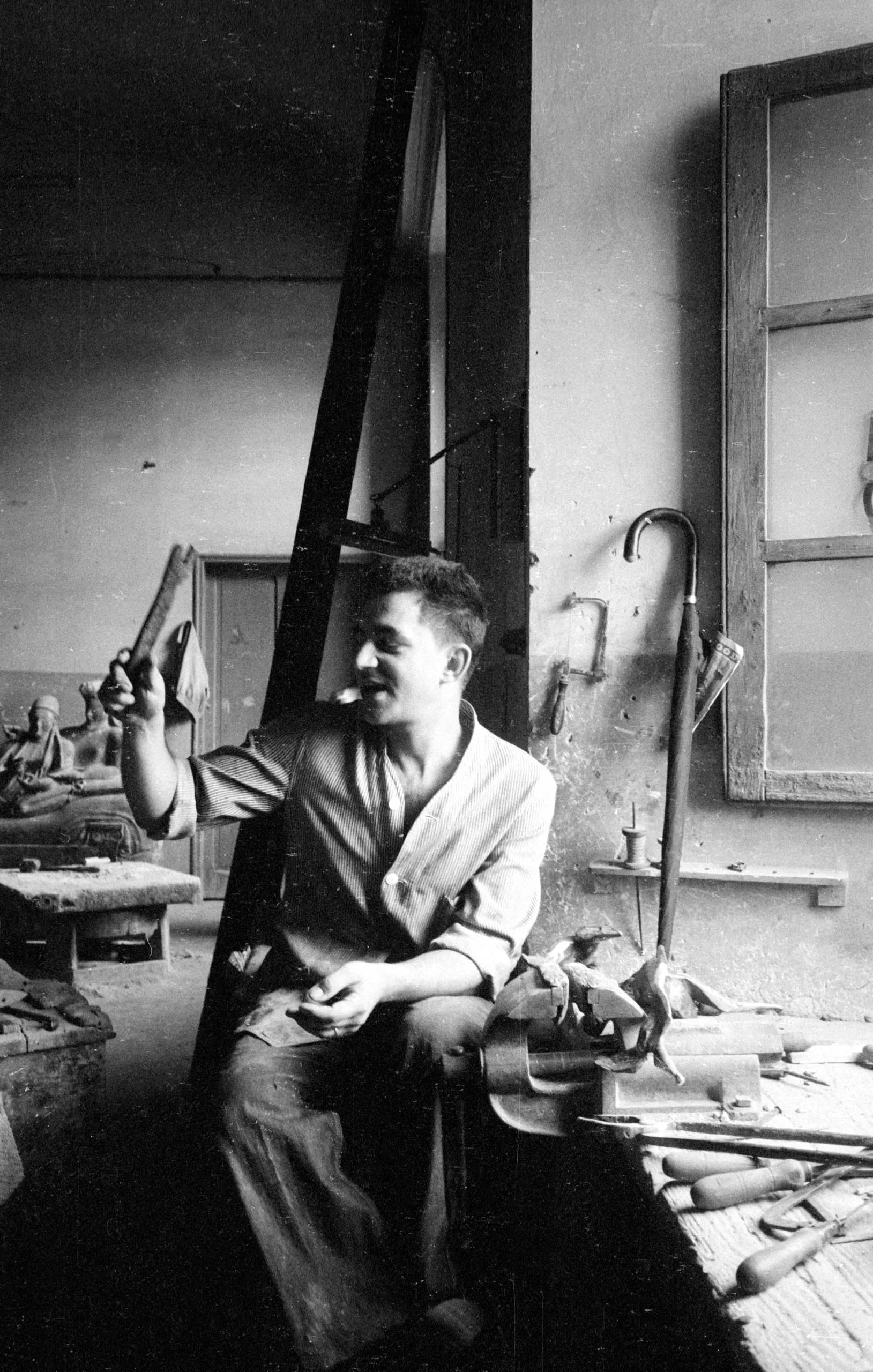 Black and white photograph of a young man in a sculptor's studio, seated among tools, holding a small object aloft and looking upward