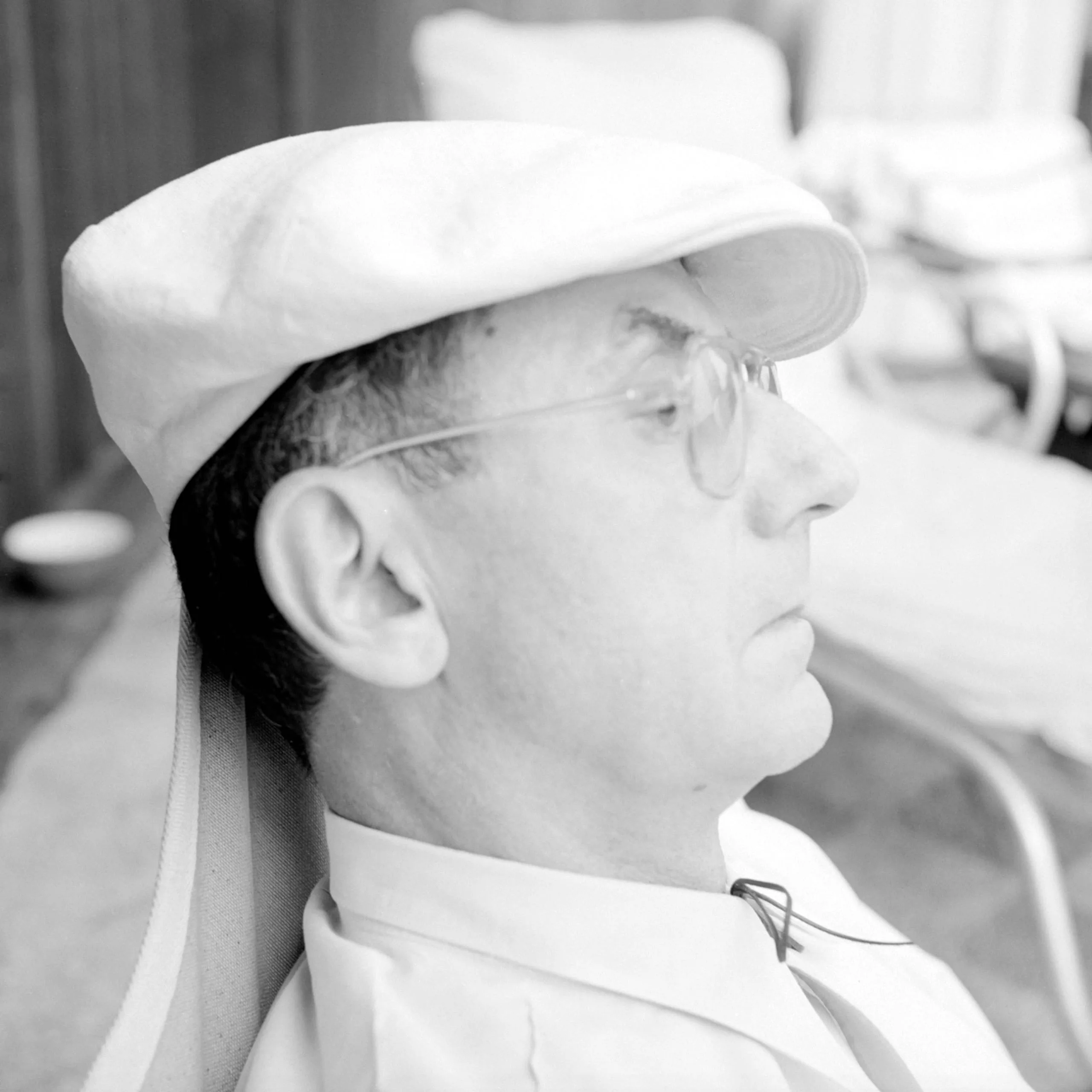 Black and white portrait photograph, man in strict profile facing right, wearing a flat cap, wire-rimmed glasses, and a barber's cape