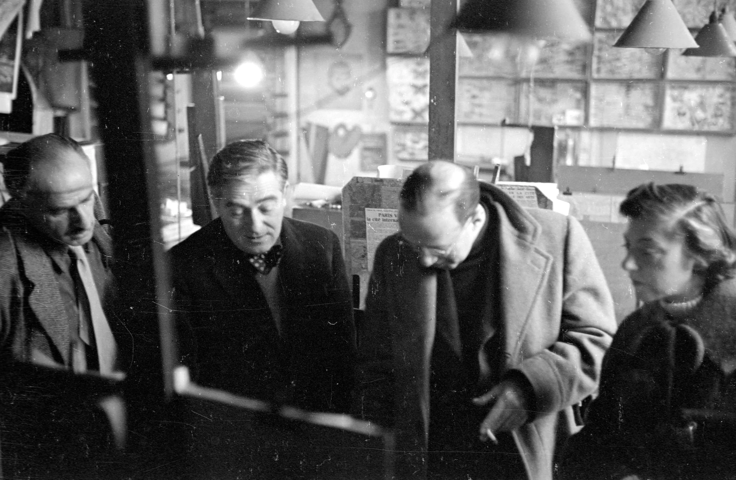 Black and white photograph of four adults gathered inside a dimly lit shop, leaning over a counter, with hanging lamps and printed materials visible in the background