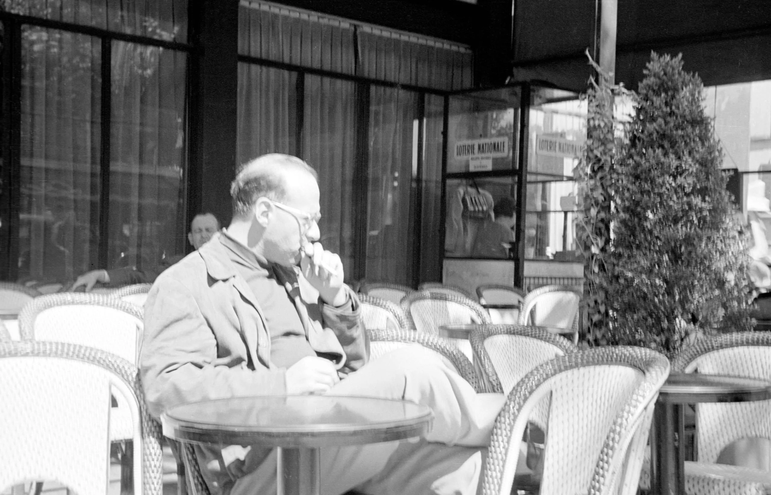 Black and white photograph of a man in glasses and a light jacket seated in profile at a small round table on an outdoor café terrace, surrounded by empty wicker chairs