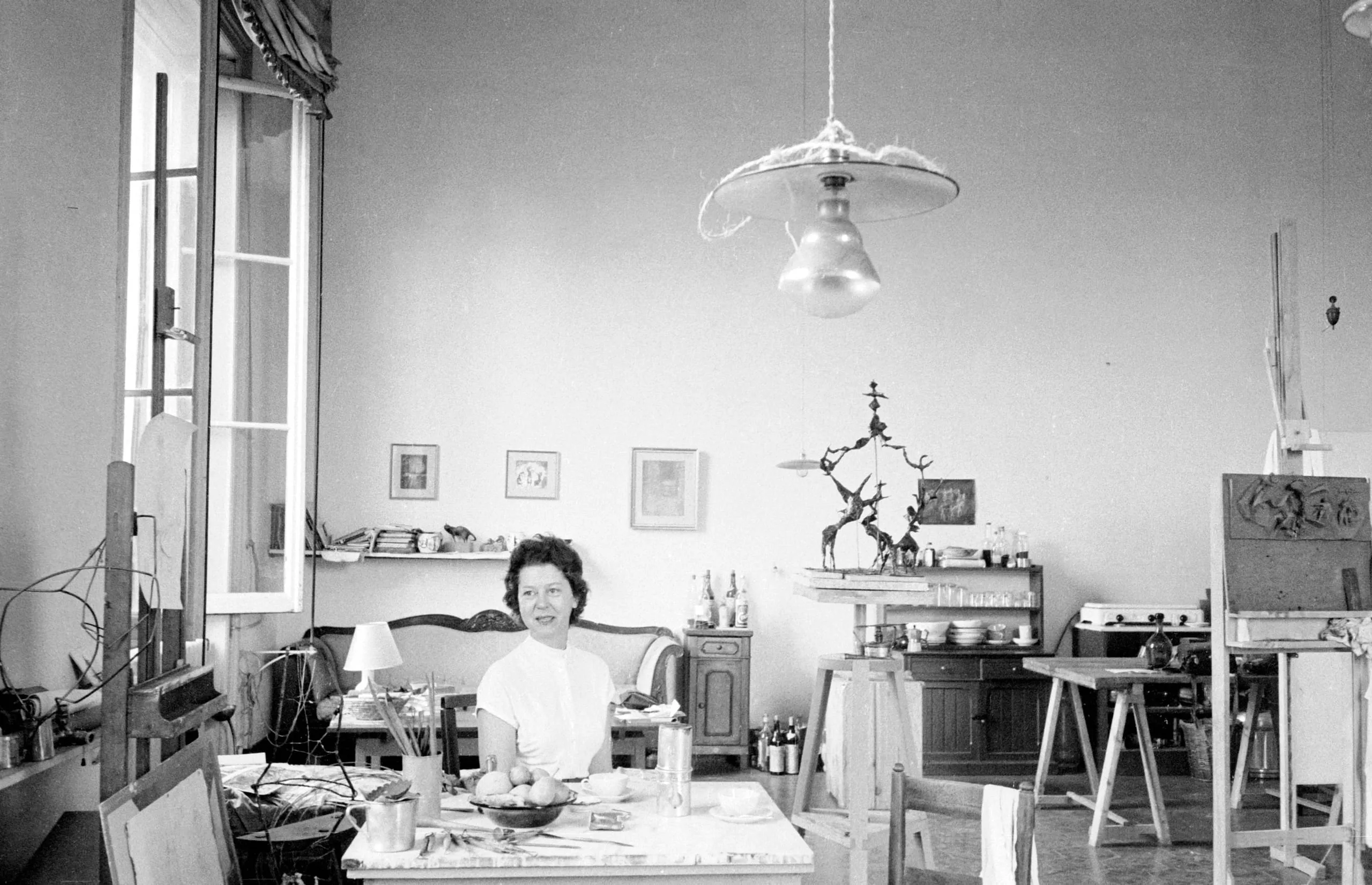 Black and white photograph of a woman in a white top seated at a worktable in a high-ceilinged artist's studio, with easels, shelves, and artwork visible around her