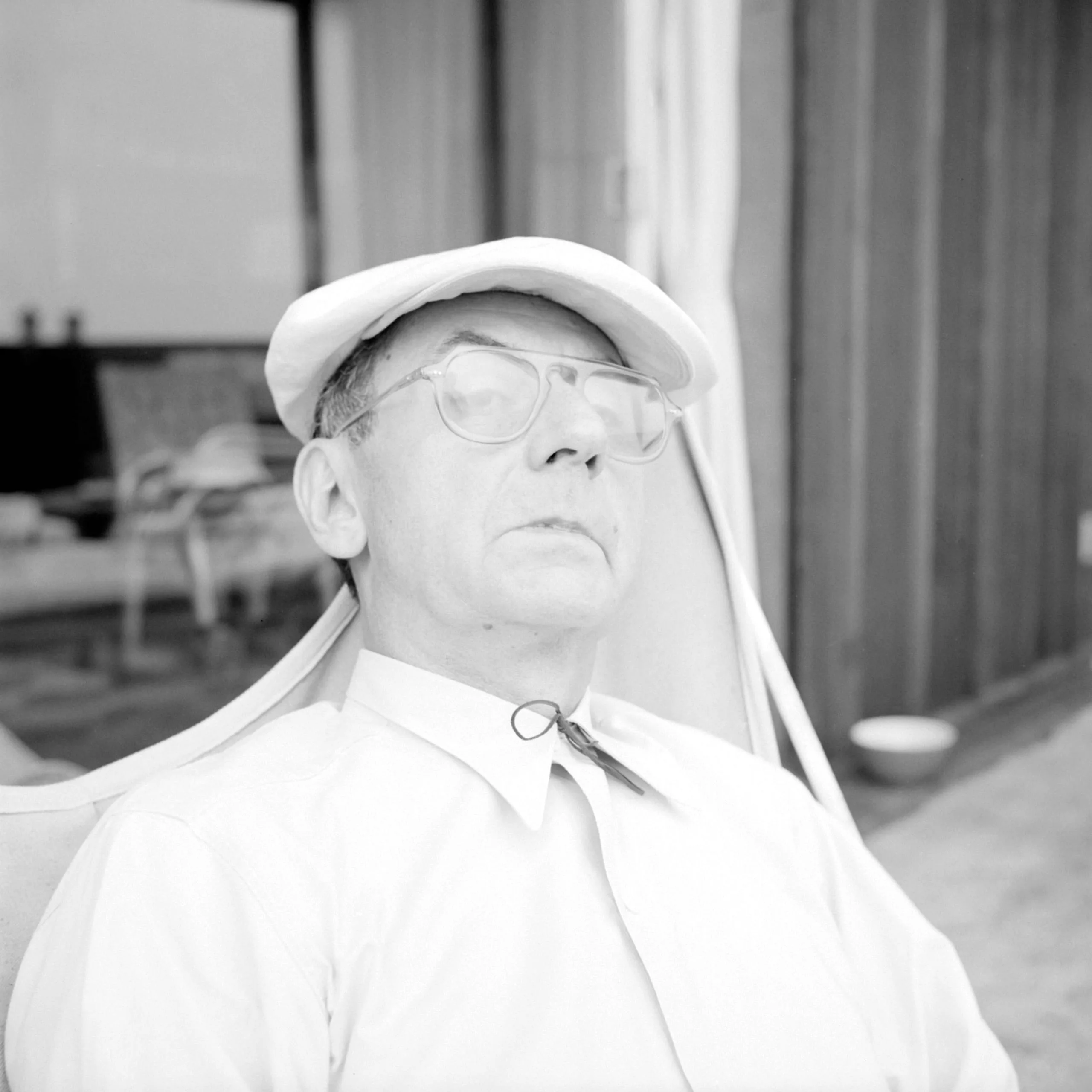 Black and white photograph, head-and-shoulders portrait of a middle-aged man in a flat cap and round eyeglasses, light fabric draped around his face and collar, chin tilted upward