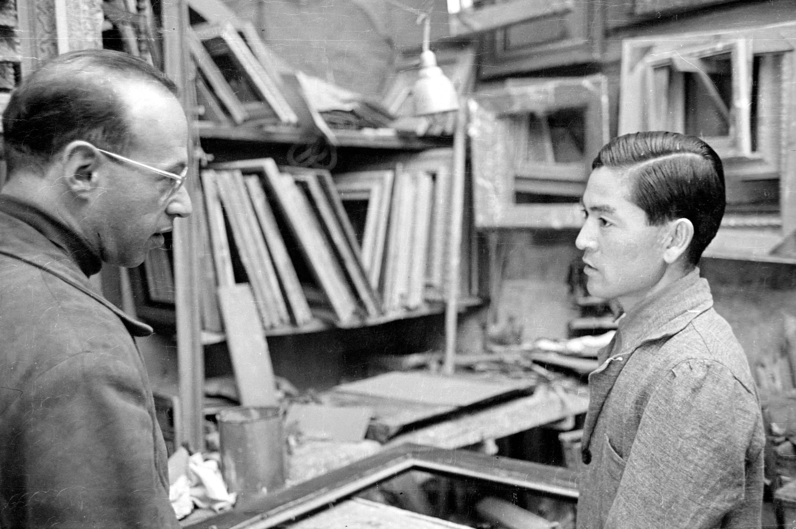 Black and white photograph of two men in conversation inside a frame shop or workshop, surrounded by stacked picture frames on shelves