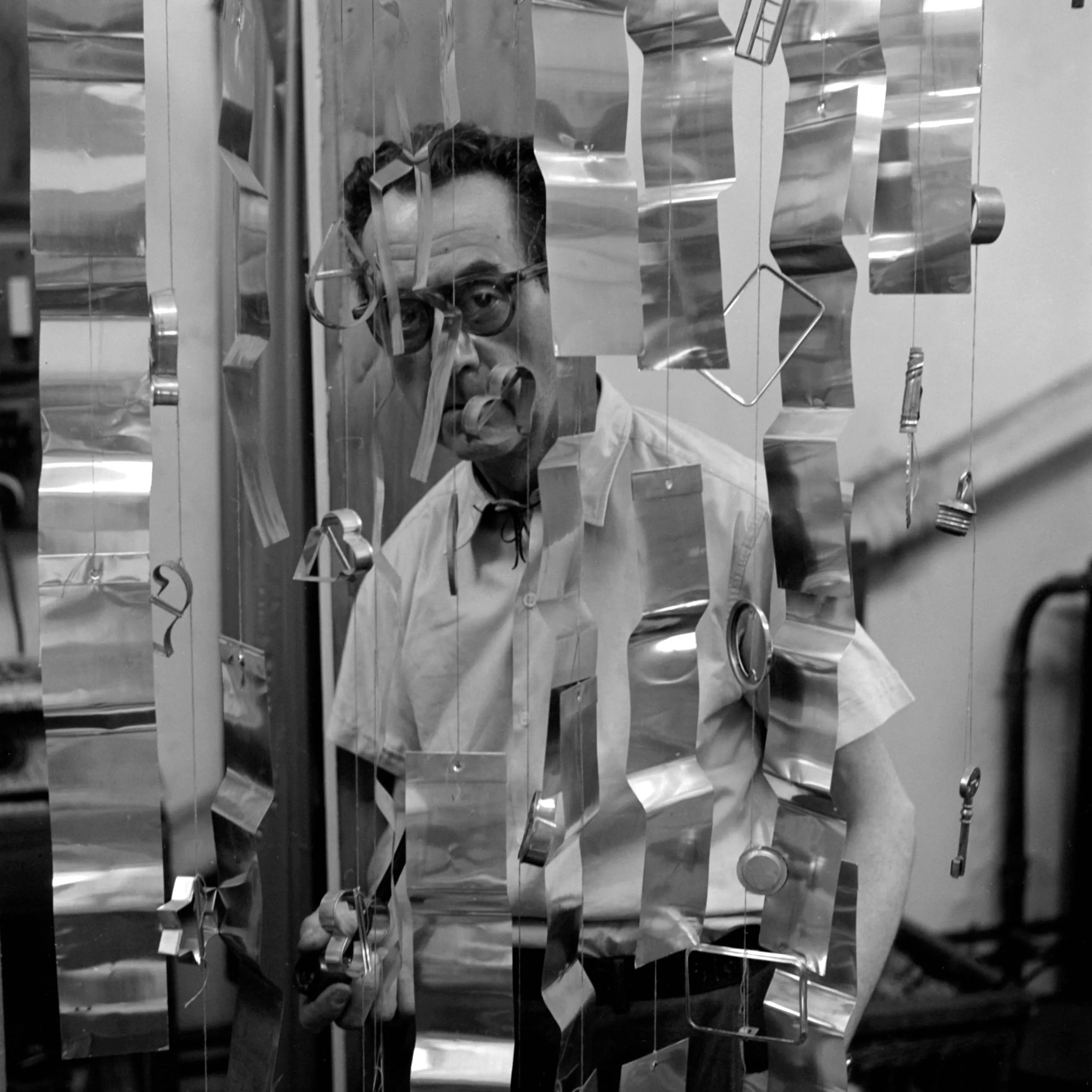 Black and white photograph of a man in a short-sleeved shirt seen through hanging curtains of metal foil strips and small suspended hardware objects
