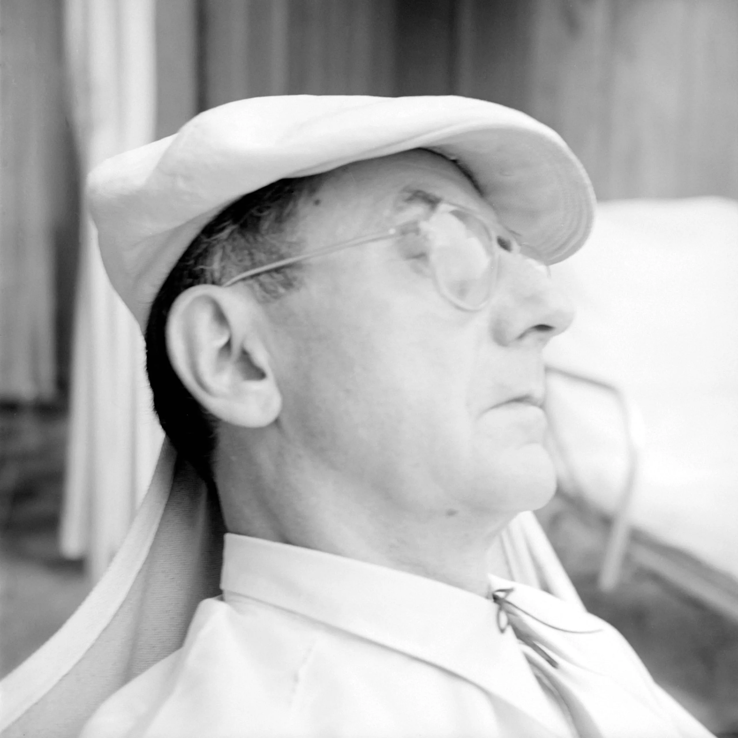 Black and white portrait photograph, man in strict profile facing right, wearing a wide-brimmed white cap with neck flap and round wire-framed glasses, soft diffused lighting