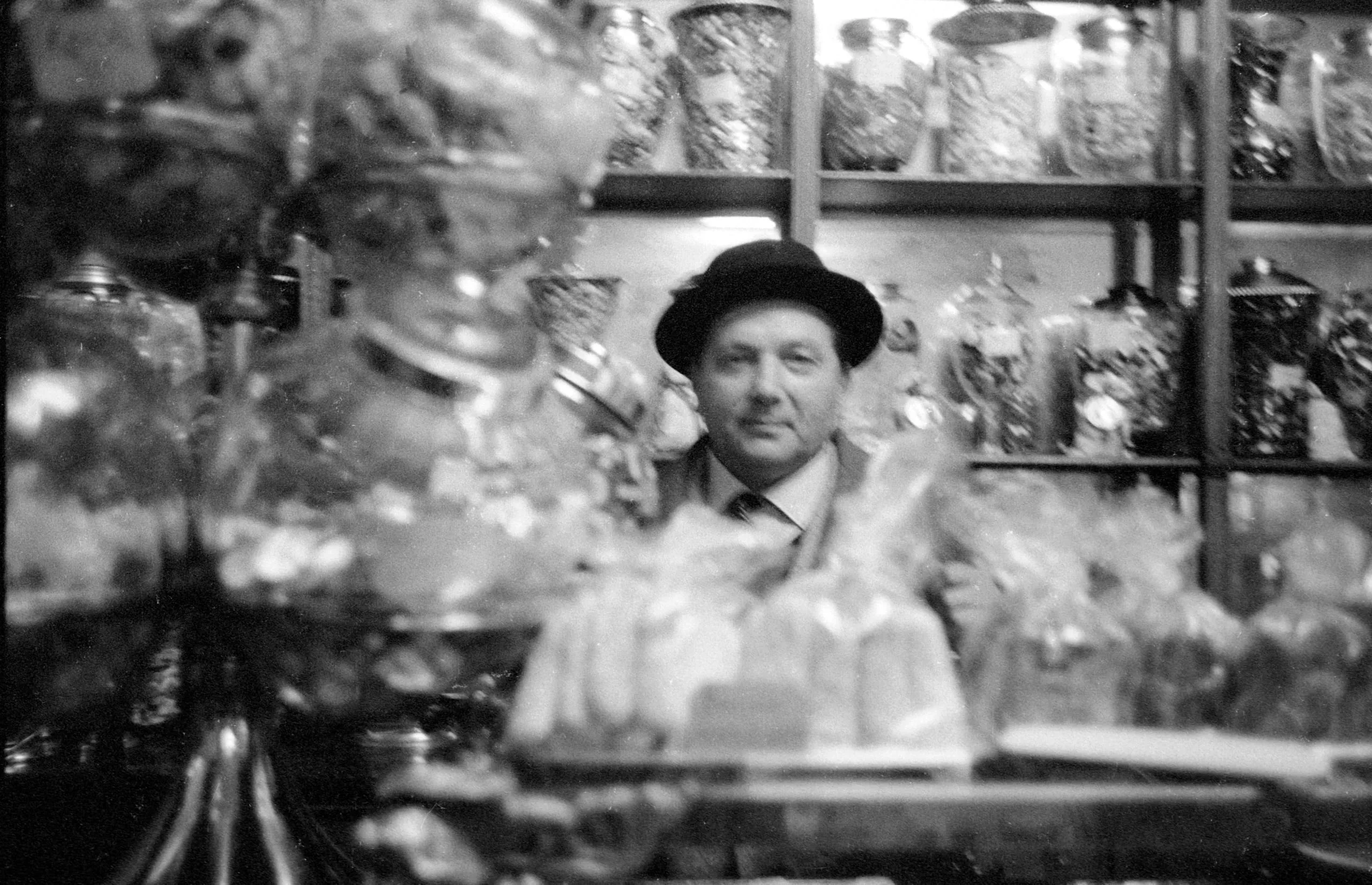 Black and white photograph of a man in a brimmed hat standing behind a counter surrounded by glass jars and bags of candy