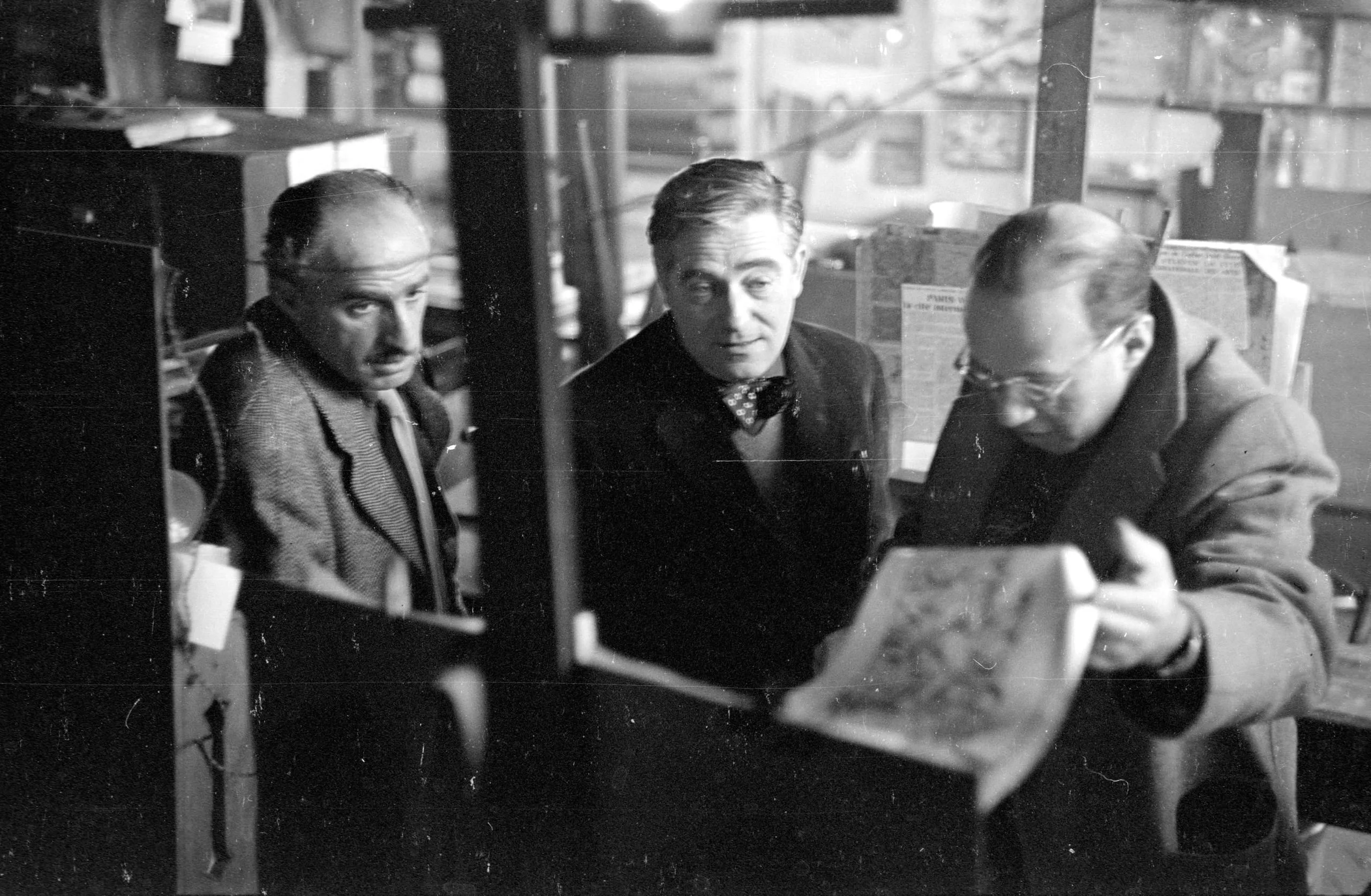 Black and white photograph of three men in suits examining an open publication in a cluttered office or workspace