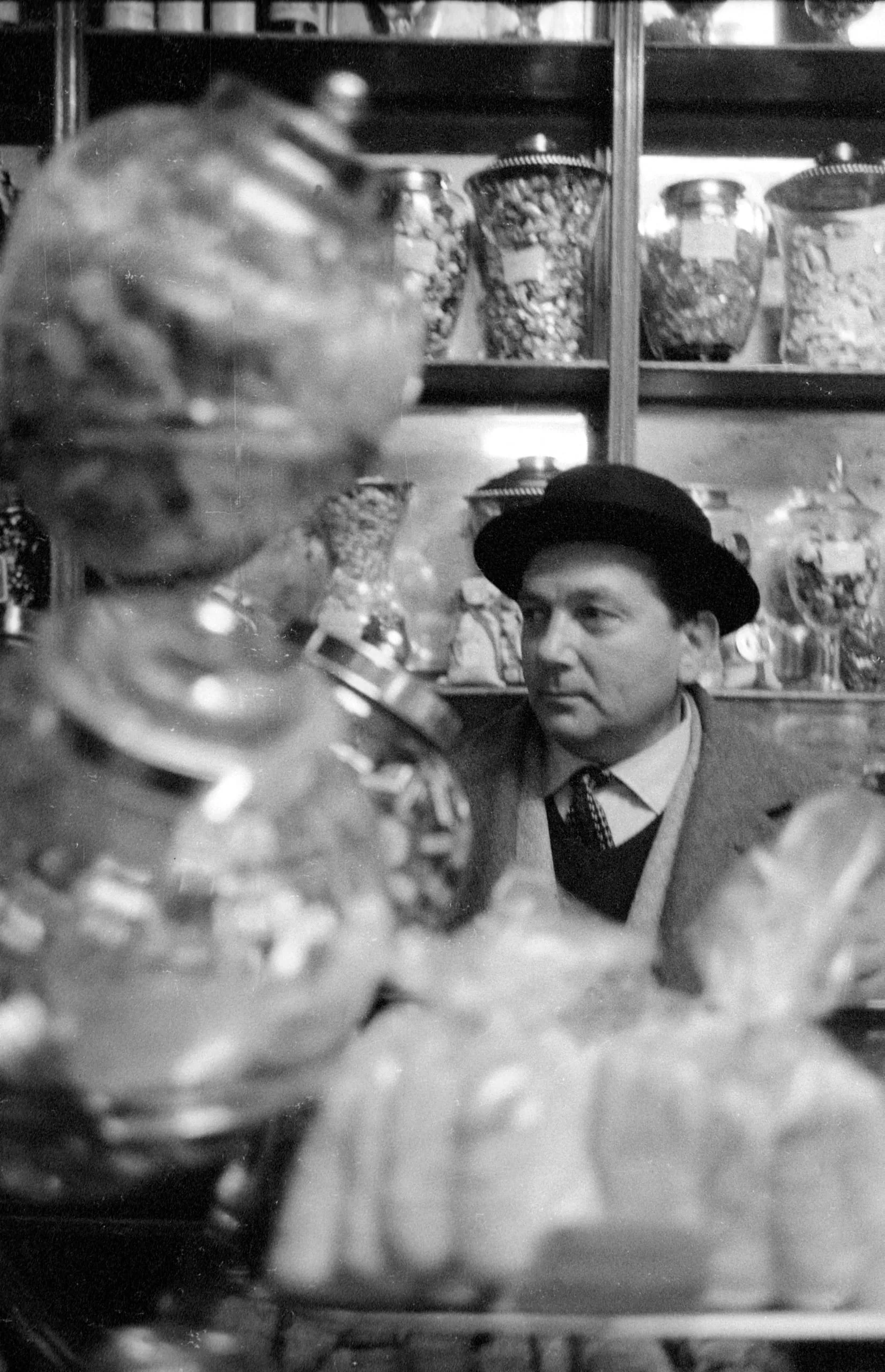Black and white photograph of a white man in a bowler hat seen through large glass candy jars, shelves of confectionery jars visible behind him