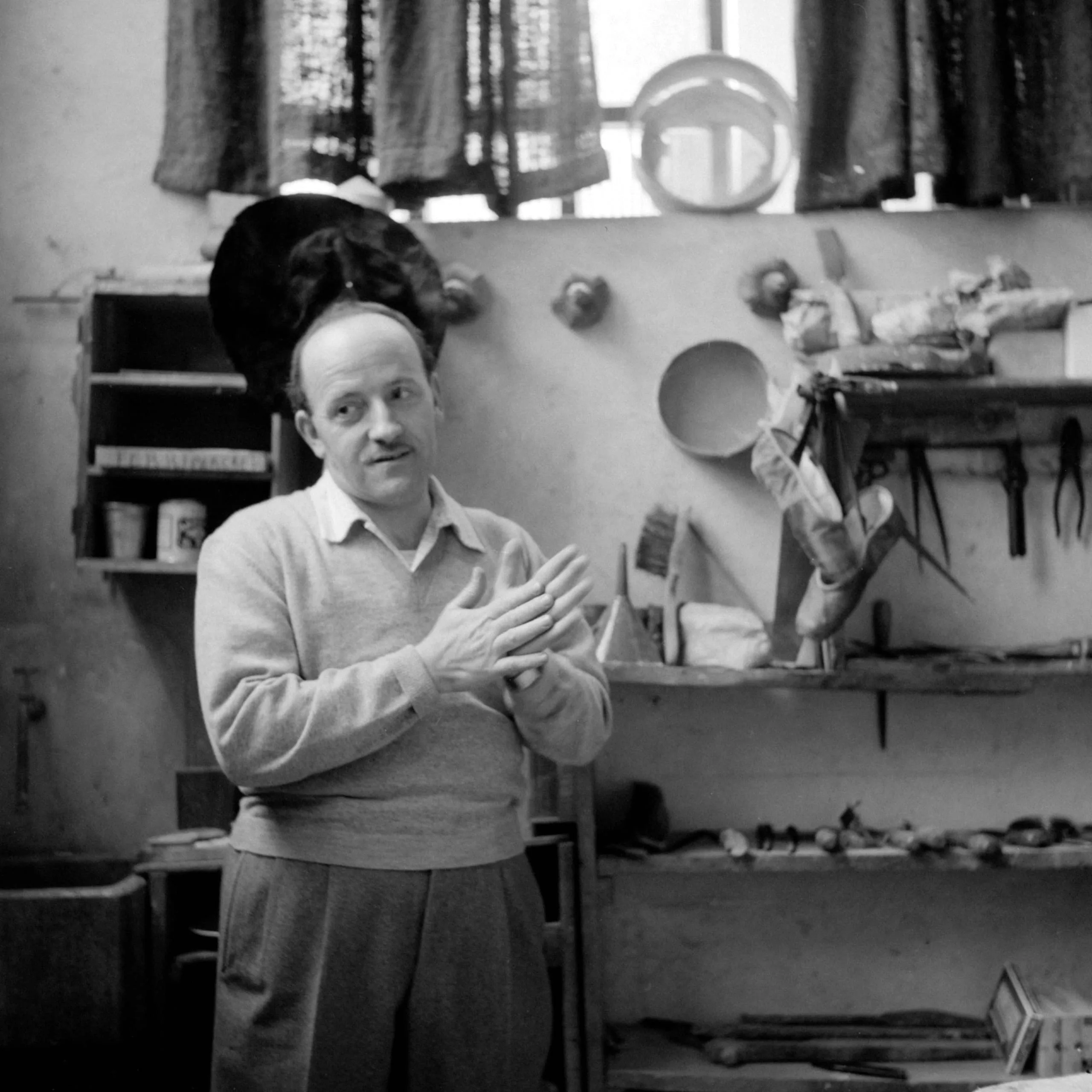 Black and white photograph of a white man in a sweater standing in a cluttered workshop, hands clasped at chest height, mouth open mid-speech