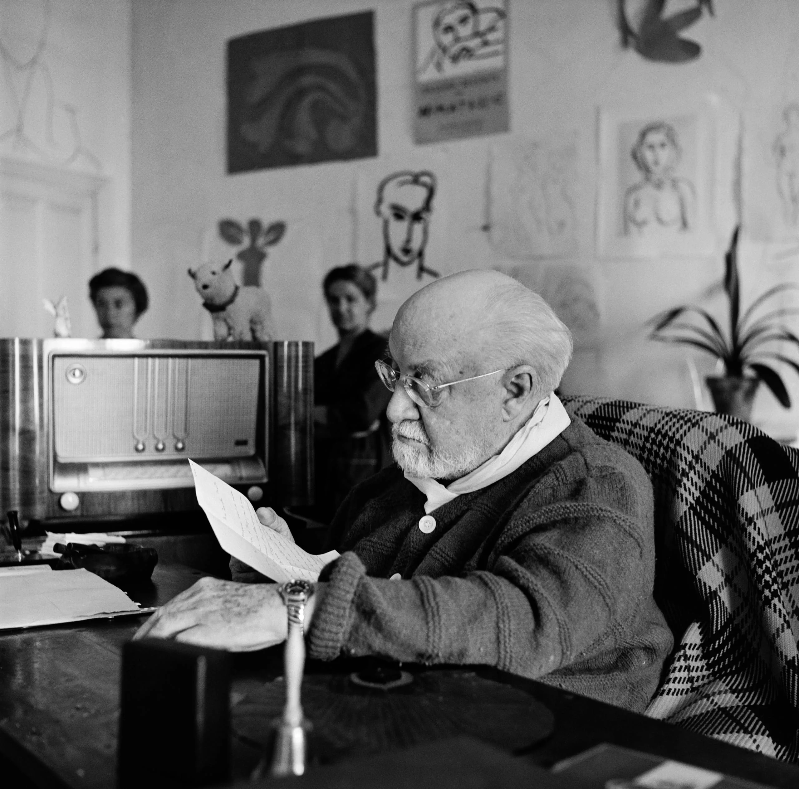 Black and white photograph of an elderly bald man with round glasses and a white beard, seated in a plaid chair reading a sheet of paper, with drawings pinned to the wall behind him