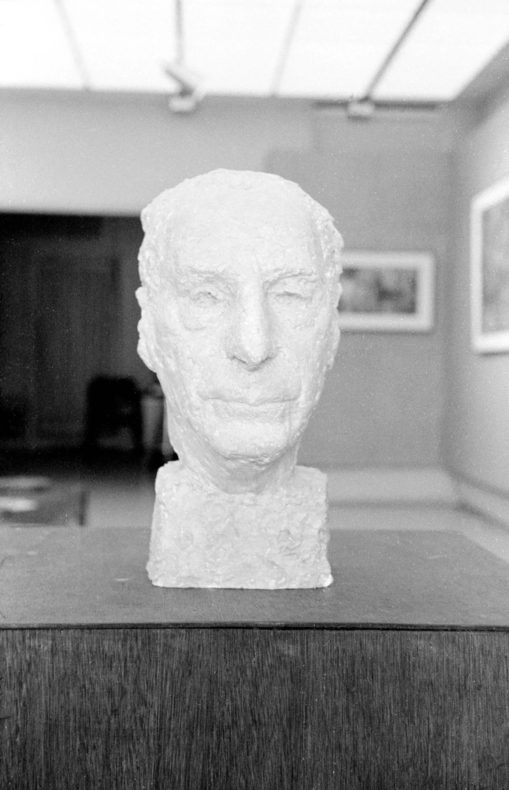 Small plaster bust of an older man's head on a wooden surface, with heavily textured, tool-marked surface and deep-set eyes, photographed in black and white