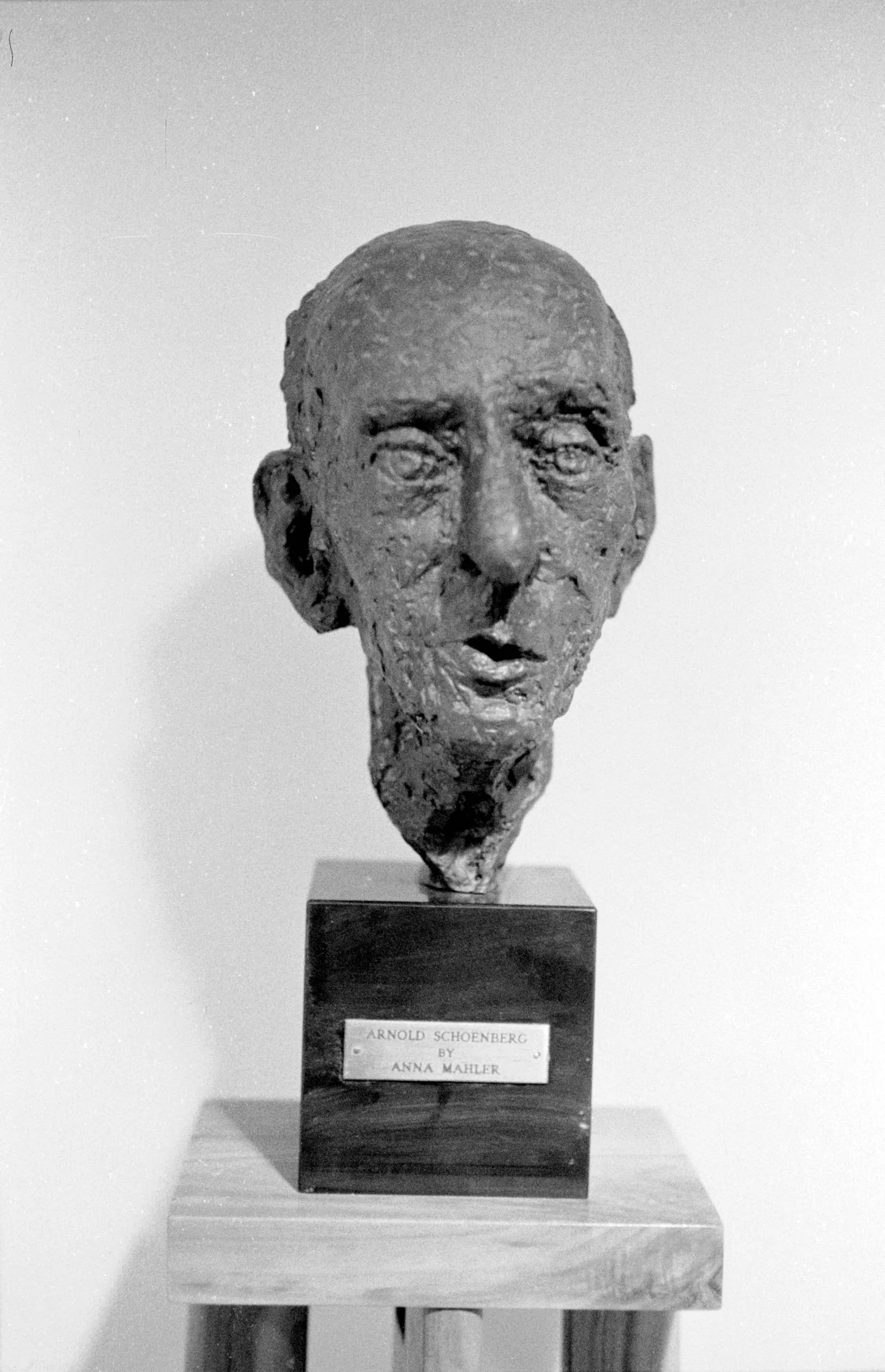 Dark bronze portrait bust of a bald older man with gaunt features and heavily textured surface, mounted on a dark square pedestal with an identifying plaque