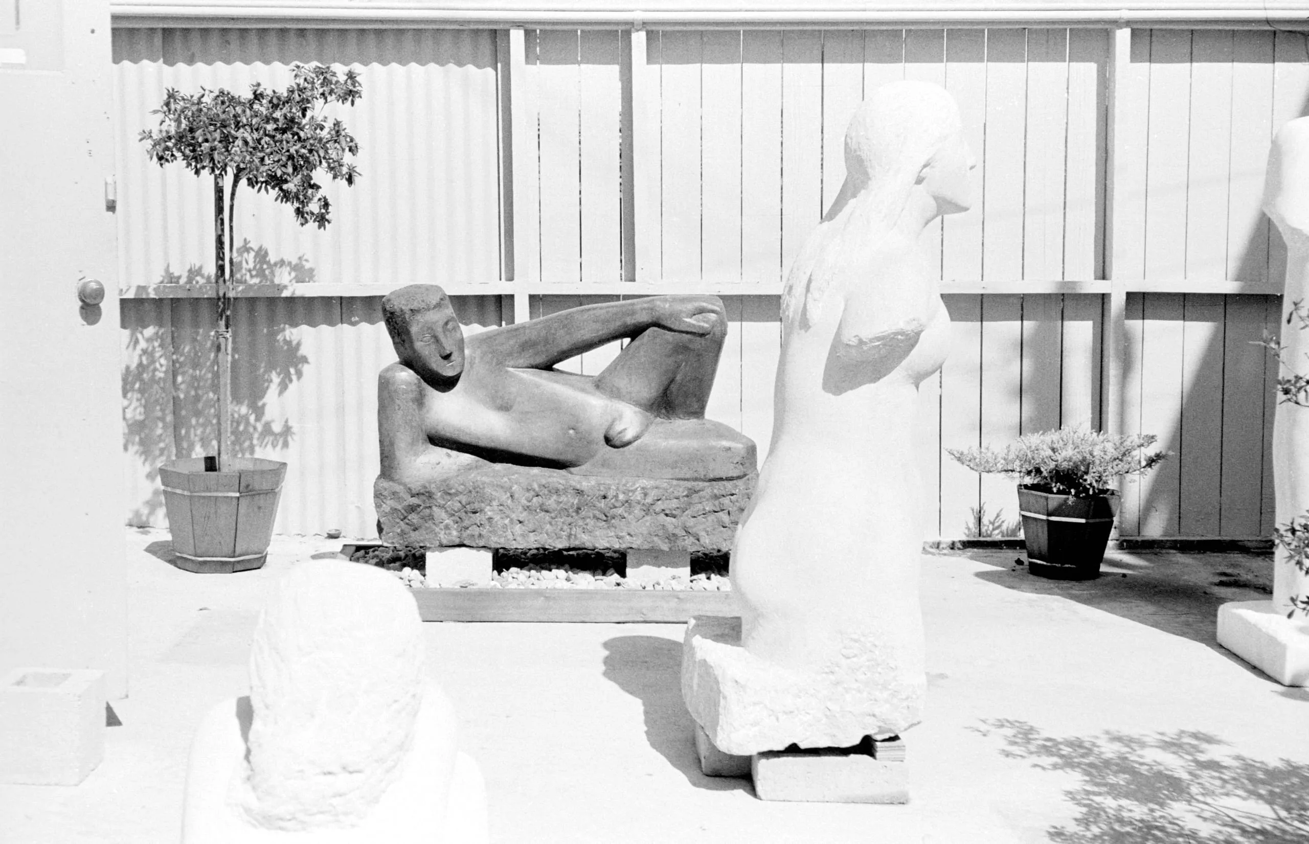 Black and white photograph of an outdoor sculpture garden with a reclining stone nude figure on a plinth, a standing torso, and two rough unfinished forms on a paved courtyard